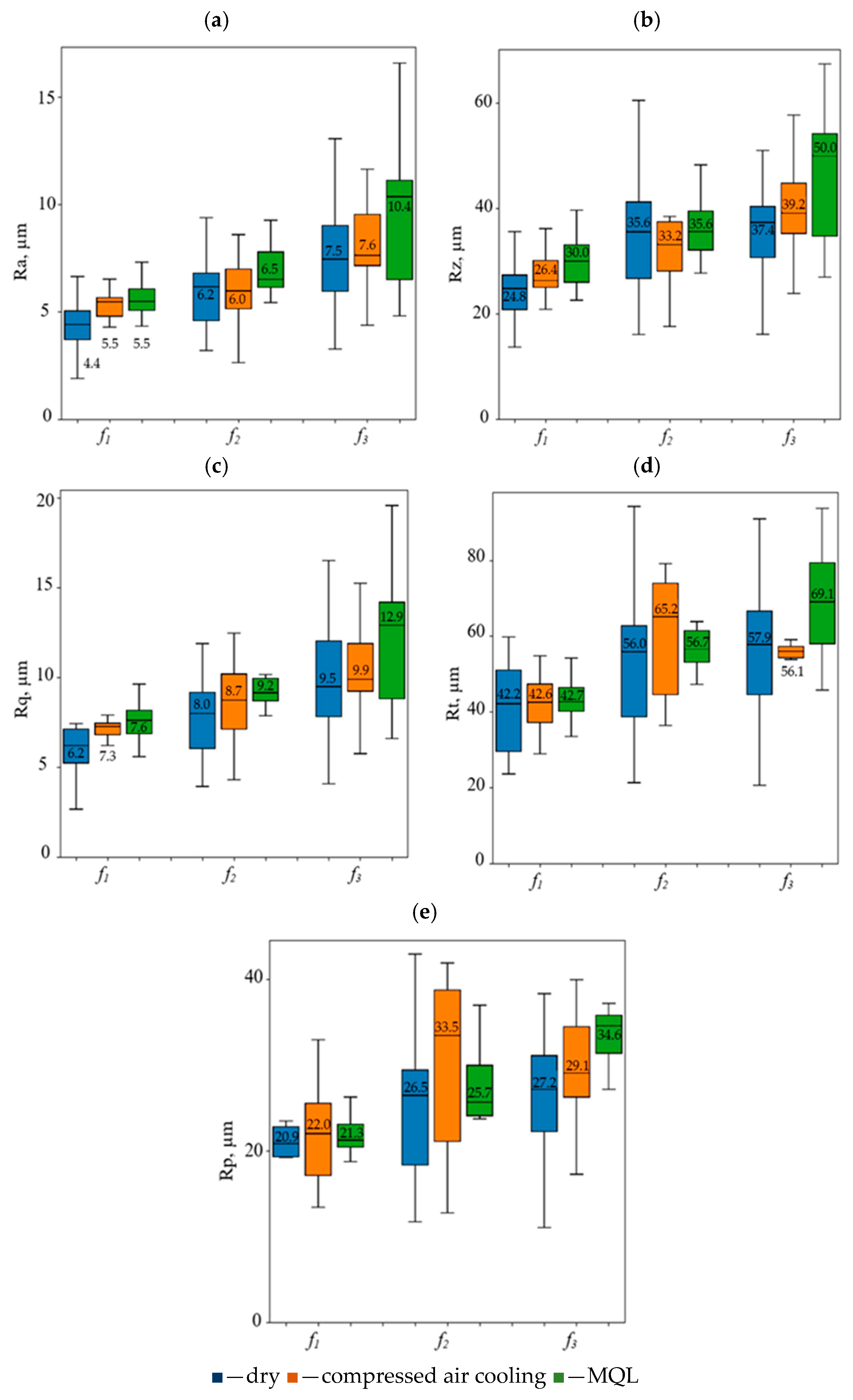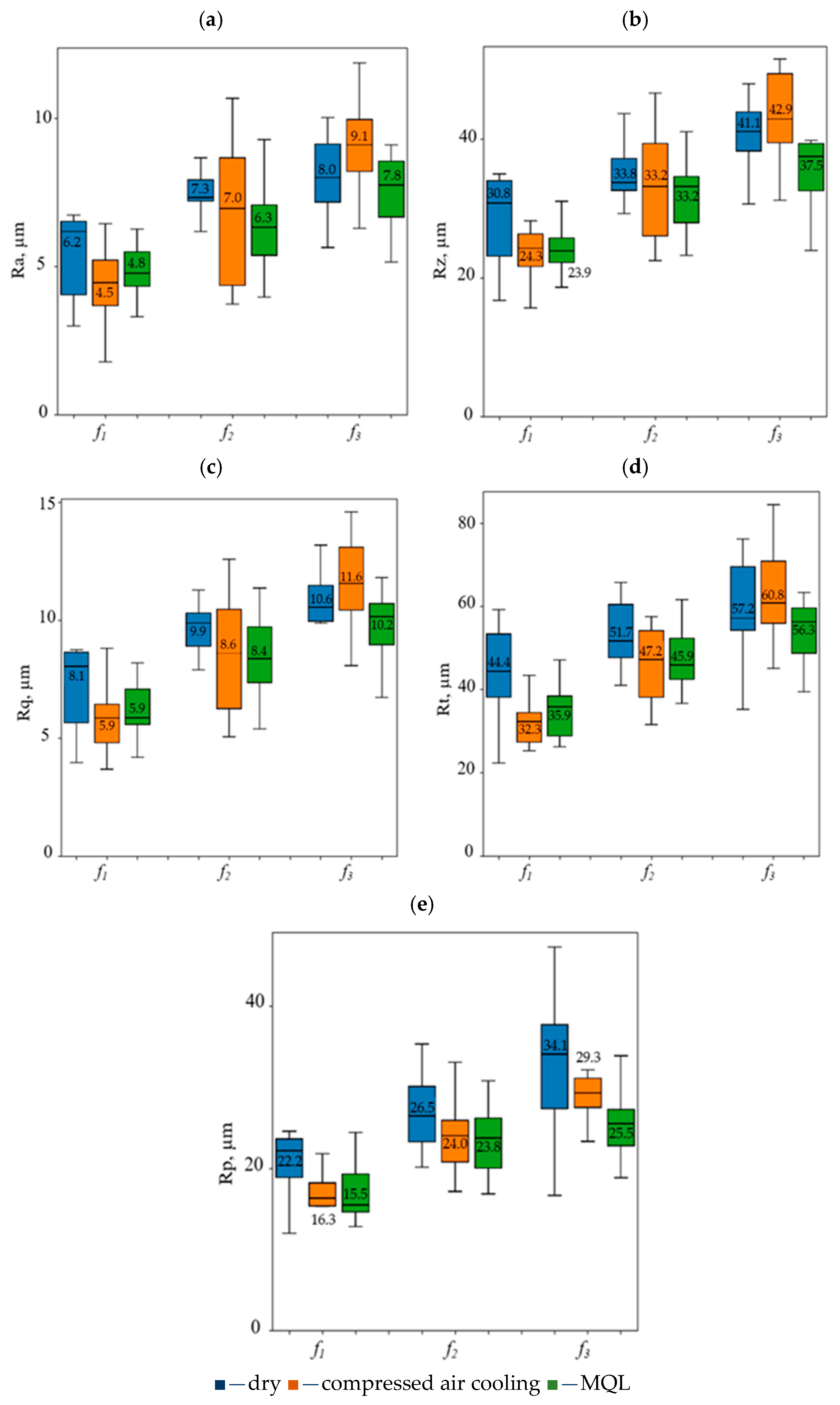 - For beech wood, with dry conditions and compressed air cooling, the changes in surface roughness parameters between feeds per revolution f1 and f3 were not statistically significant. However, during MQL machining, significant differences in surface roughness were observed for the same feeds per revolution.