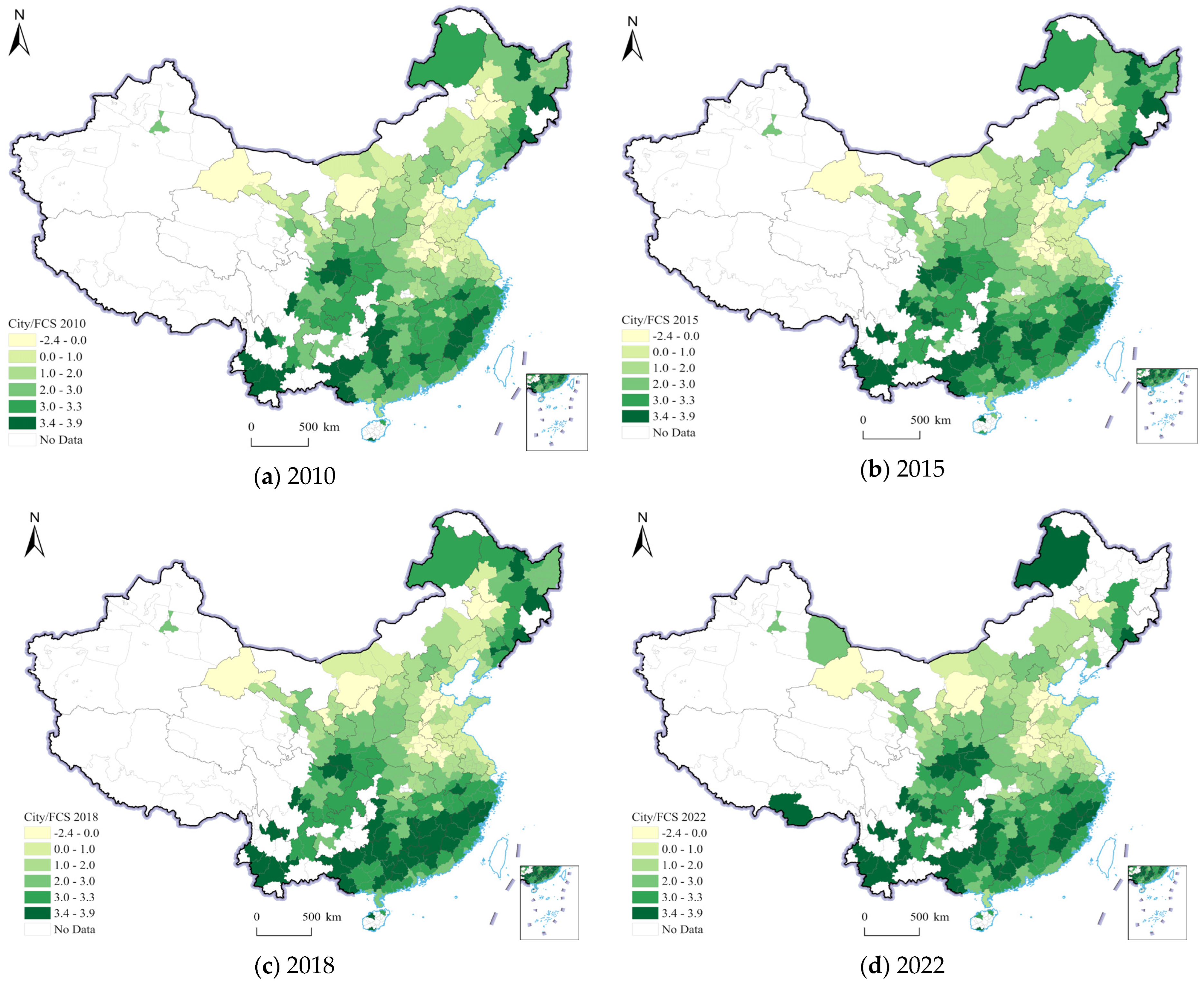 - Provide targeted support to unlock the carbon sink potential of small and medium-sized cities. Considering that non-central cities are more sensitive to FCS, regional coordination, targeted support for ecological projects, and fiscal transfers should be utilized to accelerate their green development capacity building, enabling them to play a foundational supporting role in the national dual-carbon strategy.