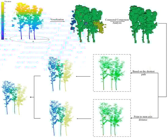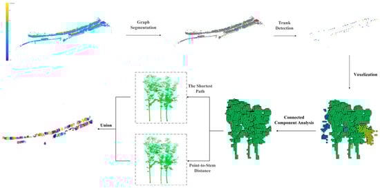 By integrating voxel connectivity with multiple optimization strategies, this method effectively avoids over-segmentation and under-segmentation issues caused by interference from nearby vegetation or noise points, while enhancing the accuracy and robustness of the segmentation results and ensuring the integrity of the overall tree structure. The overall processing flow is depicted in Figure 4.