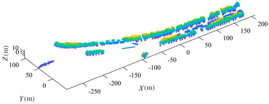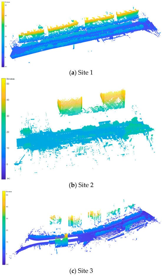 In this study, three representative road sections were selected as experimental areas for method validation and comparative testing. These areas were deliberately chosen to encompass varying levels of tree density, canopy overlap, and environmental heterogeneity, thereby ensuring that the evaluation results accurately reflect diverse street conditions. The selected sections also exhibit differences in point density and occlusion intensity caused by surrounding urban infrastructure, offering a more thorough assessment of the method’s robustness. The three experimental areas employed in this paper are illustrated in Figure 9, which displays small yet representative segments of the overall dataset.