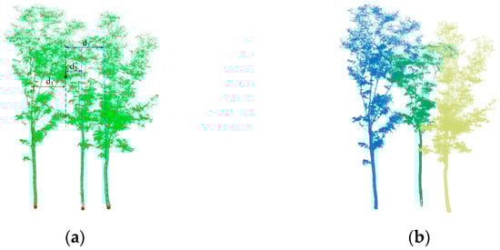 Optimized segmentation of tree point clouds based on point-to-stem axis distance. (a) The individual tree point clouds before optimized segmentation. (b) The result after optimized segmentation. is the distance between the two trees.