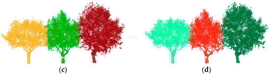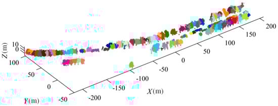Subsequently, the Euclidean distance from each point to each trunk axis is calculated. Theoretically, the distance from a point within a tree canopy to the trunk axis of its corresponding tree should be shorter than the distance from that point to the trunk axes of other trees. Based on this principle, this paper assigns labels to points across the entire point cloud according to the distance of each point to these axes, thereby assigning each point to a corresponding tree and achieving optimized segmentation of the point cloud of the entire tree. The segmentation results are shown in Figure 7. This method can effectively distinguish street trees with three intersecting and overlapping canopies, enabling precise separation of multiple trees. Specifically, street trees with three intersecting and overlapping canopies were successfully segmented. Compared to methods that rely solely on connectivity, the segmentation strategy based on the distance from a point to the stem axis better reflects the geometric structural characteristics of the trees. It also provides higher stability and segmentation accuracy in scenarios involving intersecting and overlapping canopies.