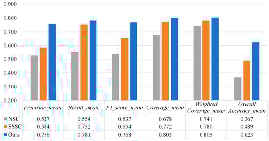 Figure 12 compares the mean values of various precision metrics for the three methods. The results show that our proposed method achieves the best performance across all five evaluation metrics. Specifically, Precision_mean, Recall_mean, and F1-score_mean reach 0.756, 0.781, and 0.768, respectively, significantly outperforming NSC (0.527, 0.554, 0.537) and SSSC (0.584, 0.752, 0.654). This indicates that our proposed method maintains high precision while also considering Recall, resulting in a more balanced and robust segmentation outcome. Our proposed method also performs excellently in Coverage_mean and Weighted Coverage_mean, reaching 0.803 and 0.805, respectively, representing improvements of approximately 18.5% and 8.6% over NSC, and approximately 4.0% and 3.2% over SSSC. In addition, our method attains the highest Overall Accuracy_mean, achieving 0.623 compared with 0.367 for NSC and 0.489 for SSSC. This substantial improvement further confirms the superior and more reliable segmentation performance of our approach across different evaluation criteria.