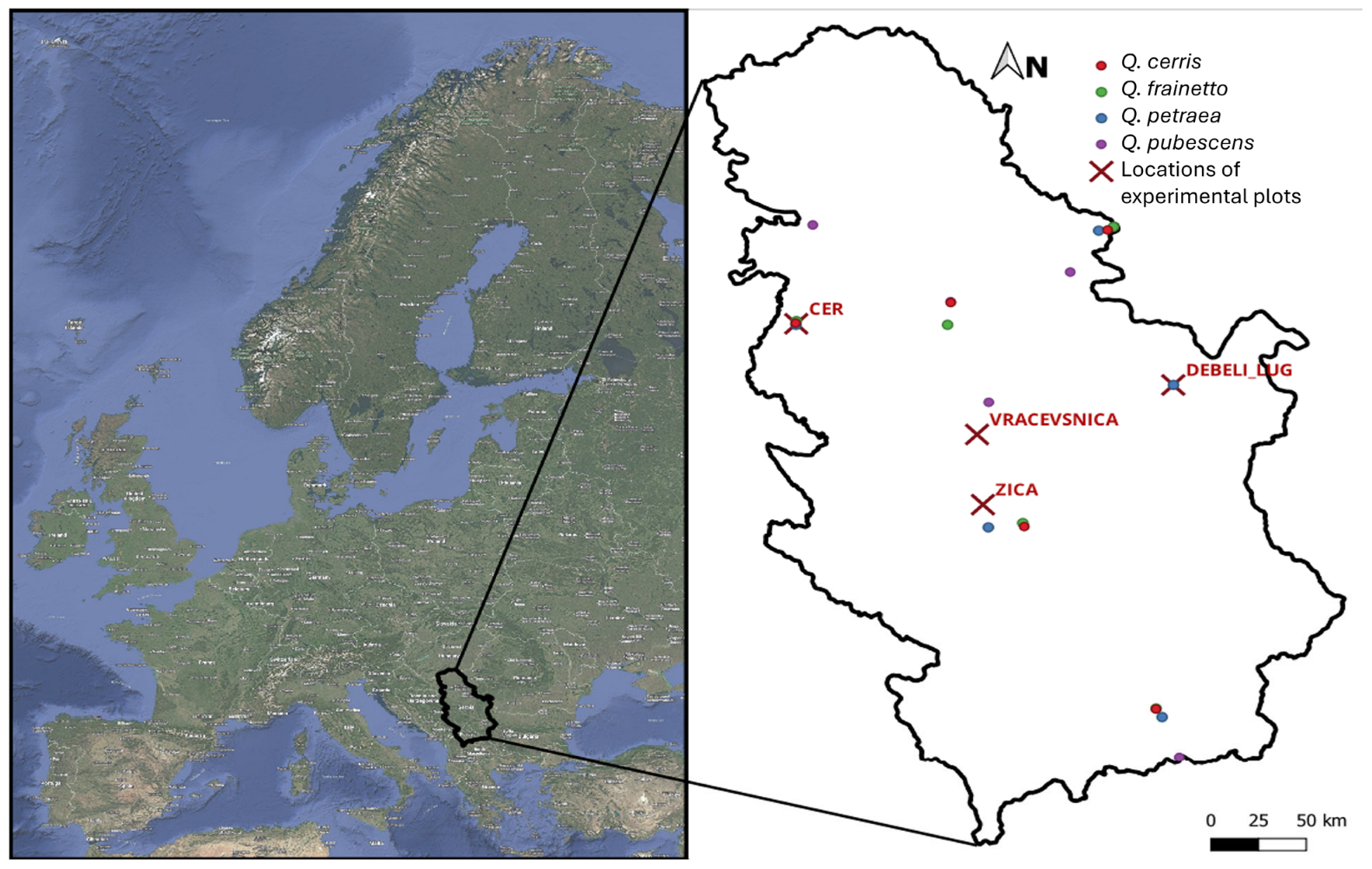 - Kanjevac, B.; Ljubičić, J.; Kerkez Janković, I.; Mijatović, L.; Devetaković, J. Regeneration of Hilly-mountainous Oak Forests in Serbia—Past Experiences and Future Perspectives. Reforesta 2024, 18, 34–58. [Google Scholar] [CrossRef]