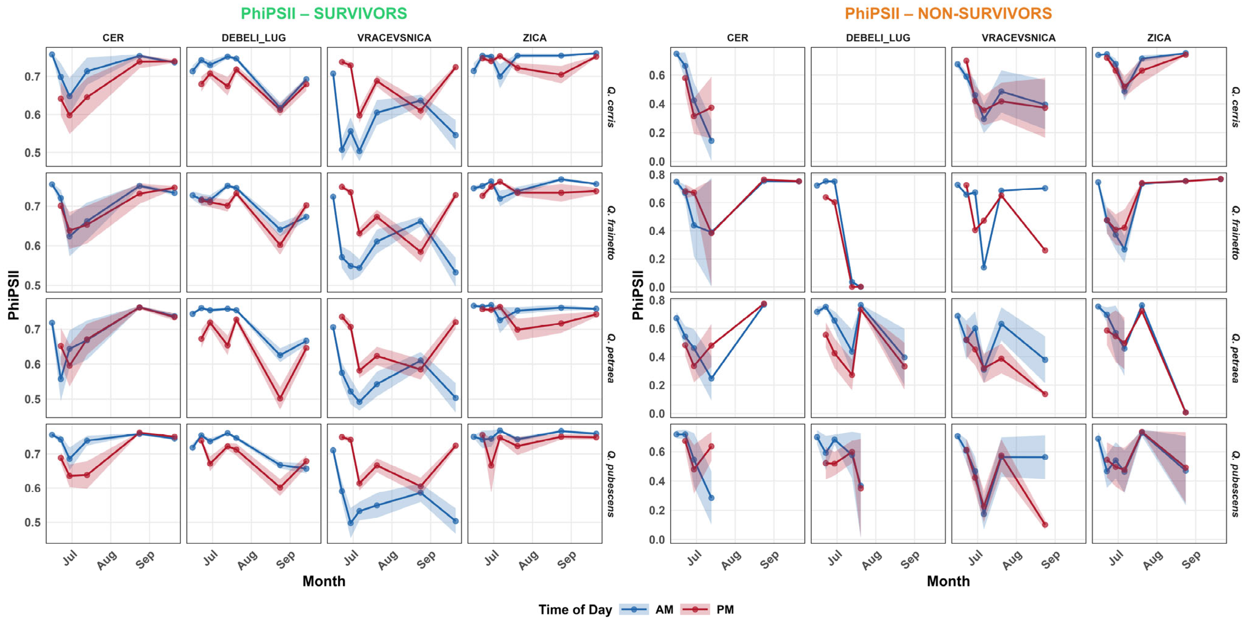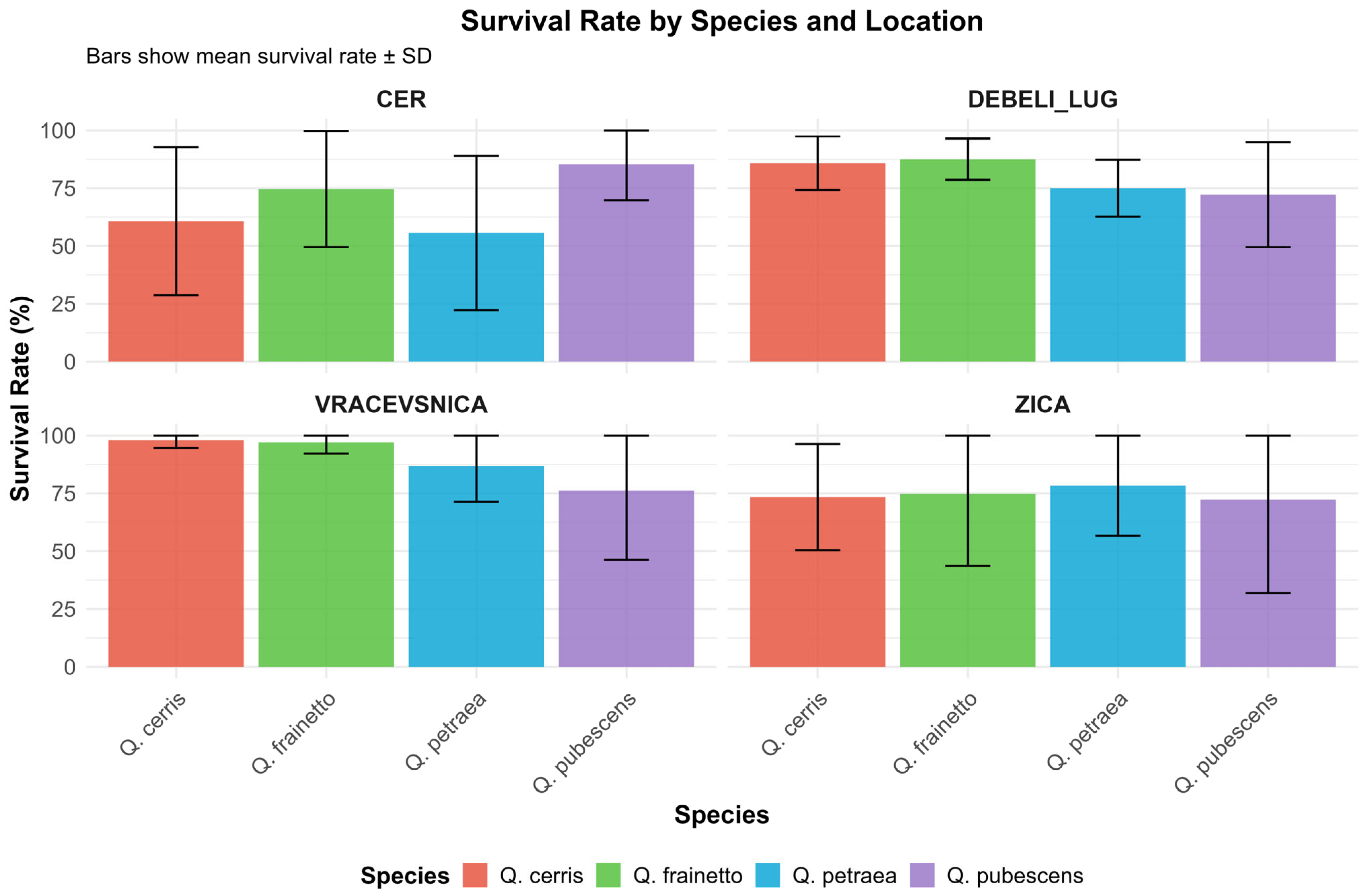 | Q. frainetto × Debeli Lug | 87.1 | −1.00 | 0.321 | 79.0 | −0.65 | 0.517 | |