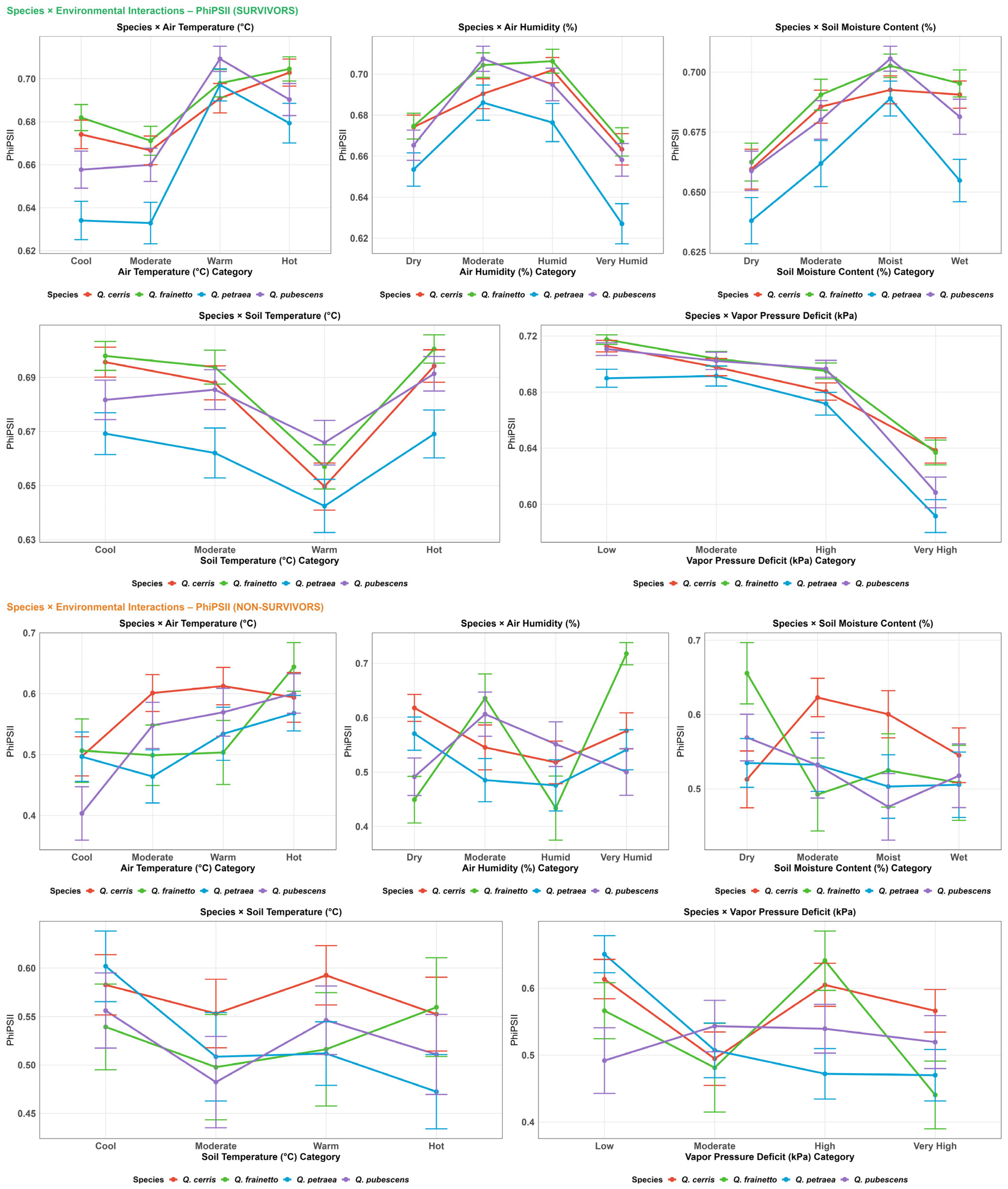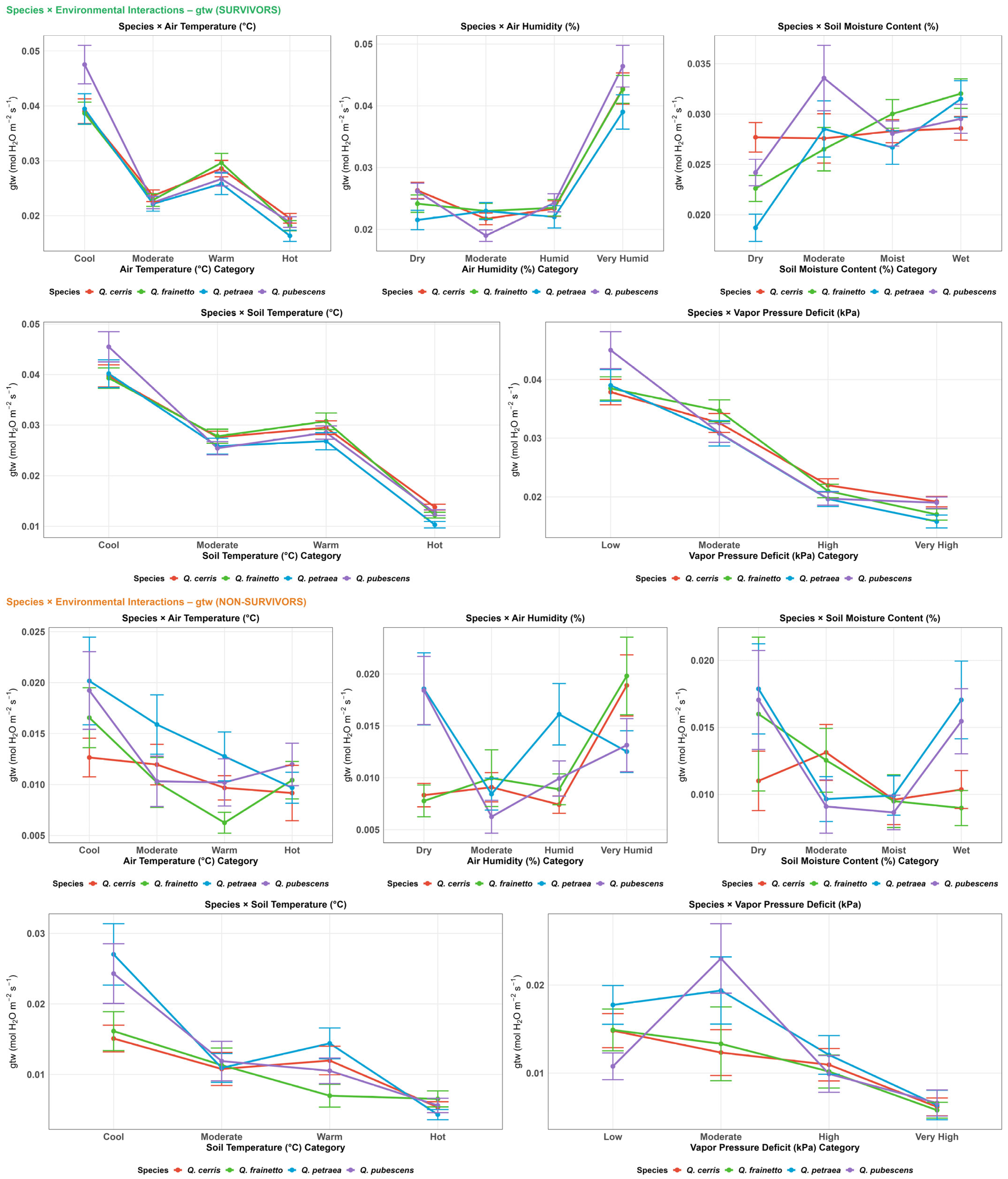 4.2. Differences in Physiological Responses Among Oak Species (H2)