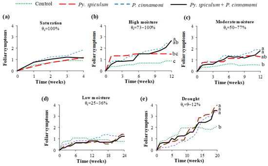 Evolution of foliar symptoms (0–4) of Quercus suber L. seedlings growing in uninoculated (control) soil and soils inoculated with Pythium spiculum Paul, Phytophthora cinnamomi Rands, or Py. spiculum + P. cinnamomi and submitted to five moisture conditions: (a) saturation; (b) high moisture; (c) moderate moisture; (d) low moisture; (e) drought. At the end of each experiment, lines with different letters differ significantly (p < 0.05) according to Tukey’s HSD test.