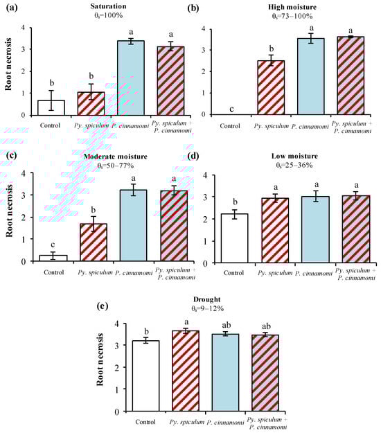 In terms of root symptoms (Figure 3), there were significant differences depending on inocula in all experiments. Under saturation (Figure 3a), only seedlings exposed to P. cinnamomi or P. cinnamomi and Py. spiculum combined showed significantly higher root necrosis compared with controls (F = 20.69, p < 0.0001). For high moisture (Figure 3b), all inoculated plants presented root symptoms significantly higher than those of controls (F = 102.07, p < 0.0001), and root symptoms caused by P. cinnamomi or P. cinnamomi + Py. spiculum were significantly higher than those induced by Py. spiculum alone. Similar results were obtained for moderate moisture (Figure 3c): all the inoculated seedlings showed root symptoms significantly higher than those controls (F = 31.82, p < 0.0001), with P. cinnamomi and the mix of pathogens causing significantly higher root necrosis values than Py. spiculum alone. However, when seedlings grew under low moisture conditions (Figure 3d), no significant differences were found among the different inocula (F = 3.69, p = 0.0234). Finally, when seedlings were droughted (Figure 3e), the control plants already exhibited severe root necrosis, with average scores above 3, and only Py. spiculum induced necrosis levels significantly higher than those observed in the controls (F = 3.17, p = 0.0396).