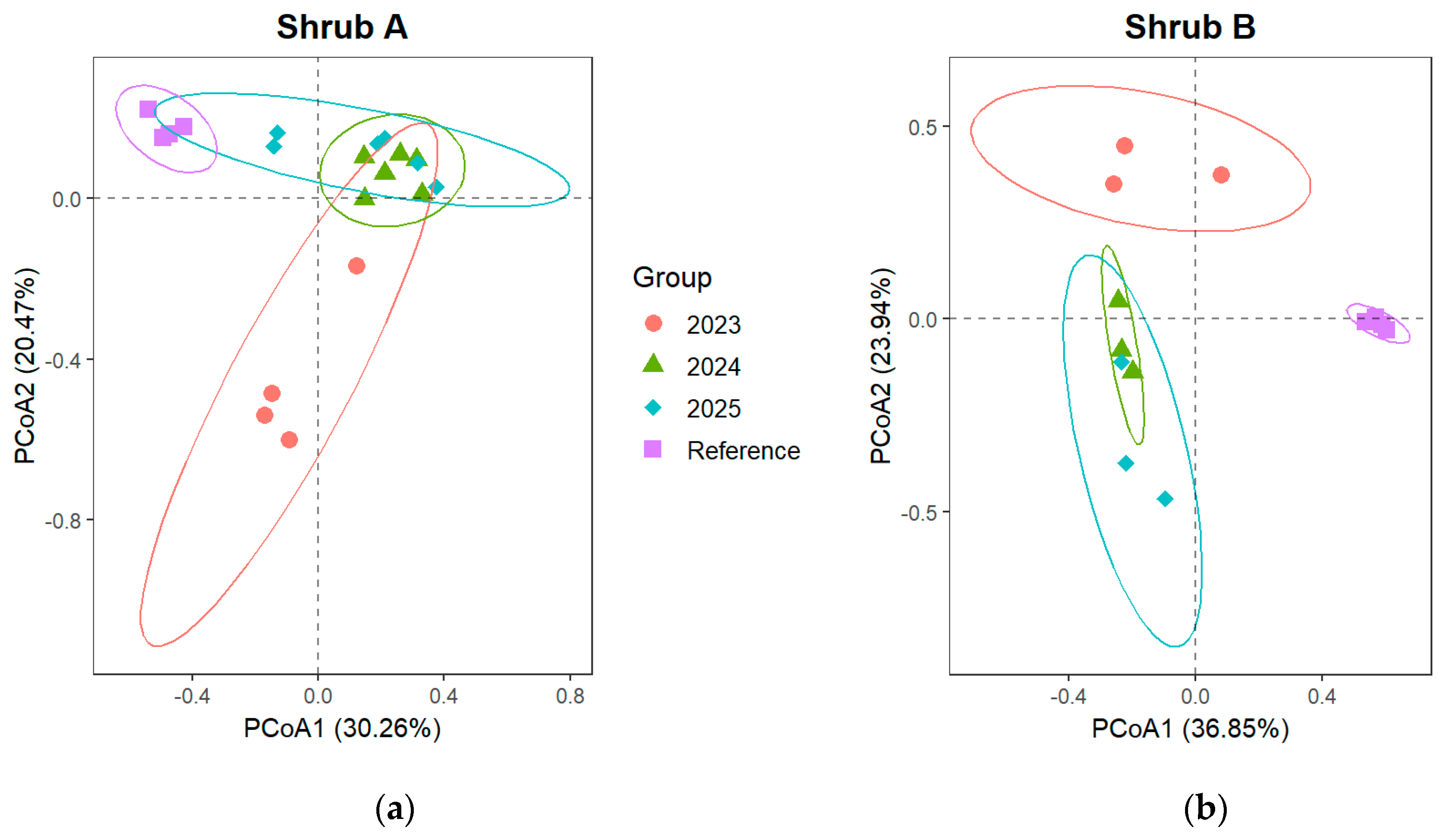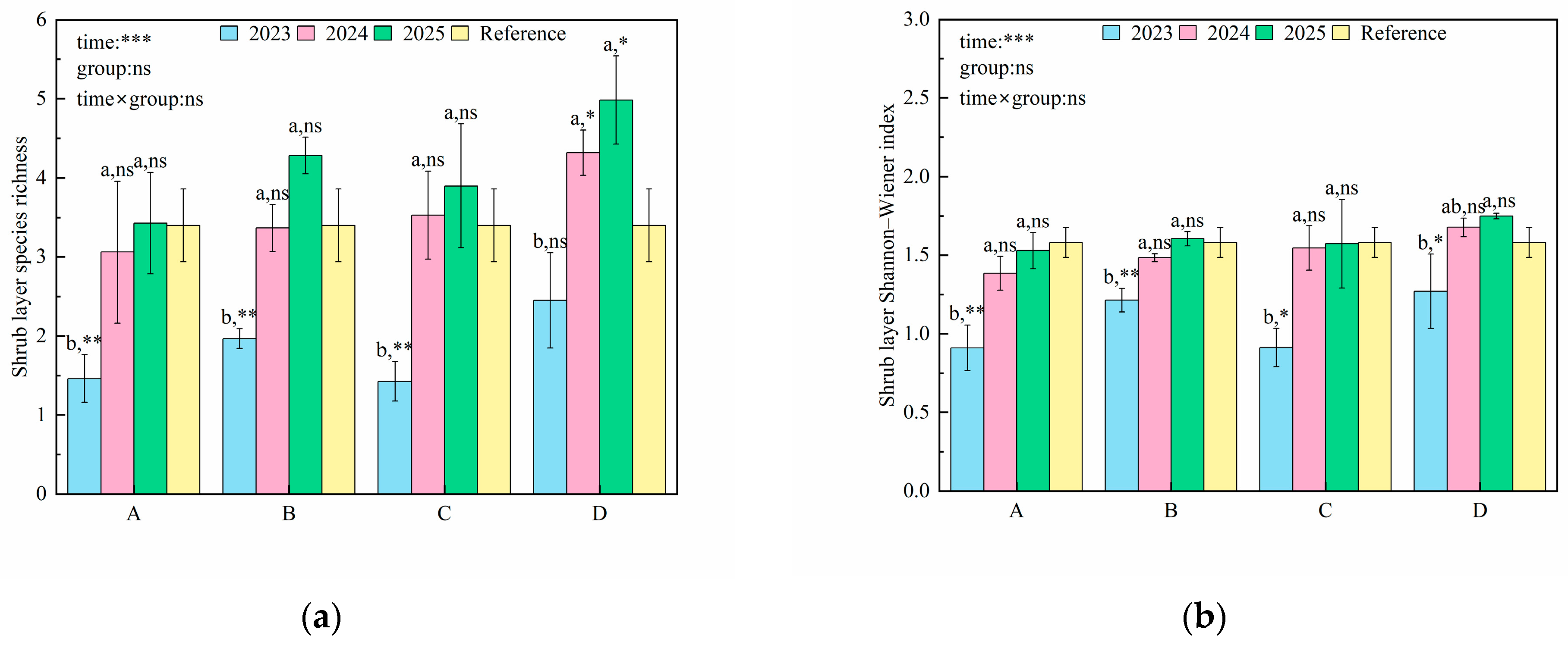 3.2.1. Changes in Sorensen Index of Shrub and Herb Layer