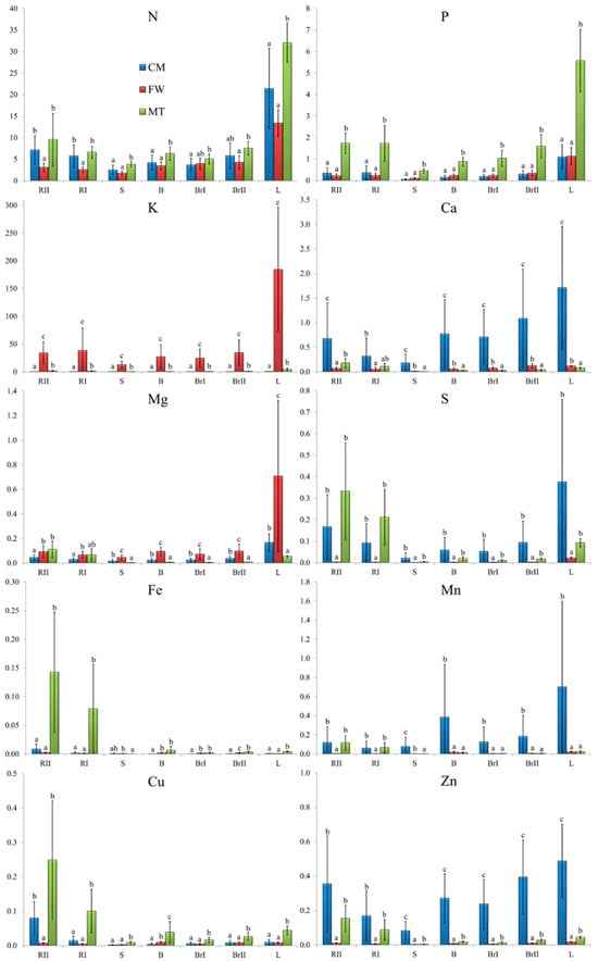 The nutrient composition and distribution of the silver birch biomass collected from the industrial waste disposal sites demonstrated several significant differences (Figure 4). The birch trees from the CM stand contained significantly more P, K, and Cu in most of the biomass fractions, while Mg was accumulated in higher amounts by the birches from the MT stand. The distribution patterns of the contents of the nutrients in the birch biomass varied depending on the type of element and the stand. Typically, the leaves had the highest nutrient contents (N, P, K, Mg, S, Mn, and Zn). In the MT stand, the highest elemental accumulation was also observed in the second-order roots (Ca, Fe, and Cu). Among the studied biomass fractions, the stemwood had the lowest accumulation of all elements. In terms of the mean contents of the biomass fractions, among the macronutrients, the highest values were for N (2199.7–23,230.0 mg kg−1), while the lowest were for P (71.6–1969.0 mg kg−1). Among the micronutrients, the highest contents were noted for Zn (86.6–1008.5 mg kg−1) and the lowest for Cu (1.2–190.3 mg kg−1).