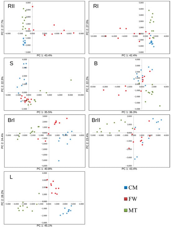 Principal Component Analysis (PCA) for the individual silver birch (Betula pendula Roth) biomass fractions (projection of cases on the plan of factors). Note: CM—stand on historical copper mine waste heap; FW—stand on industrial waste (phosphogypsum) disposal site of abandoned chemical plant; MT—stand on mine-tailings disposal site of former Pb and Zn mine; RII—second-order roots, RI—first-order roots, S—stemwood, B—bark at a height ≈ 130 cm, BrI—first-order branches, BrII—second-order branches, and L—leaves.