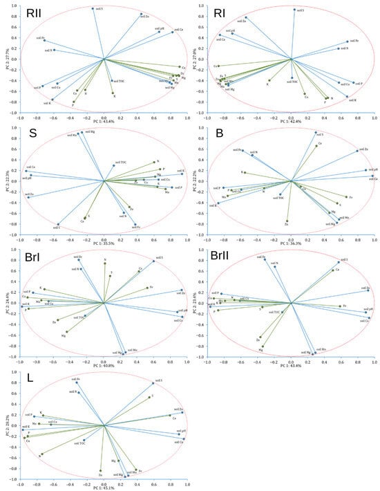Principal Component Analysis (PCA) of individual silver birch (Betula pendula Roth) biomass fractions and soil characteristics. Note: green lines—biomass components/properties, blue lines—soil components/properties, RII—second-order roots, RI—first-order roots, S—stemwood, B—bark at a height ≈130 cm, BrI—first-order branches, BrII—second-order branches, and L—leaves.