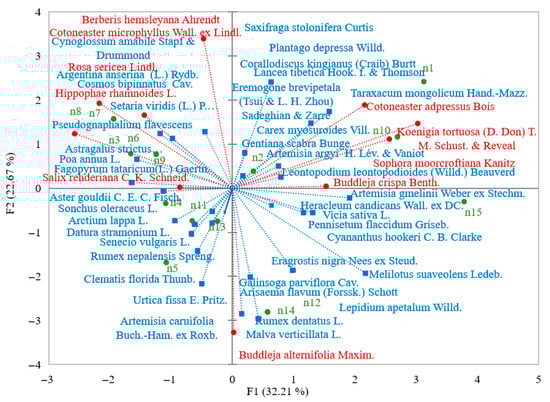 - Shrub–herb associations: PCA revealed several recurring plant combinations, including Rosa sericea with Cynoglossum amabile, Cotoneaster adpressus with Taraxacum mongolicum, and Hippophae rhamnoides with Setaria viridis. These assemblages may represent promising candidates for restoration plantings.