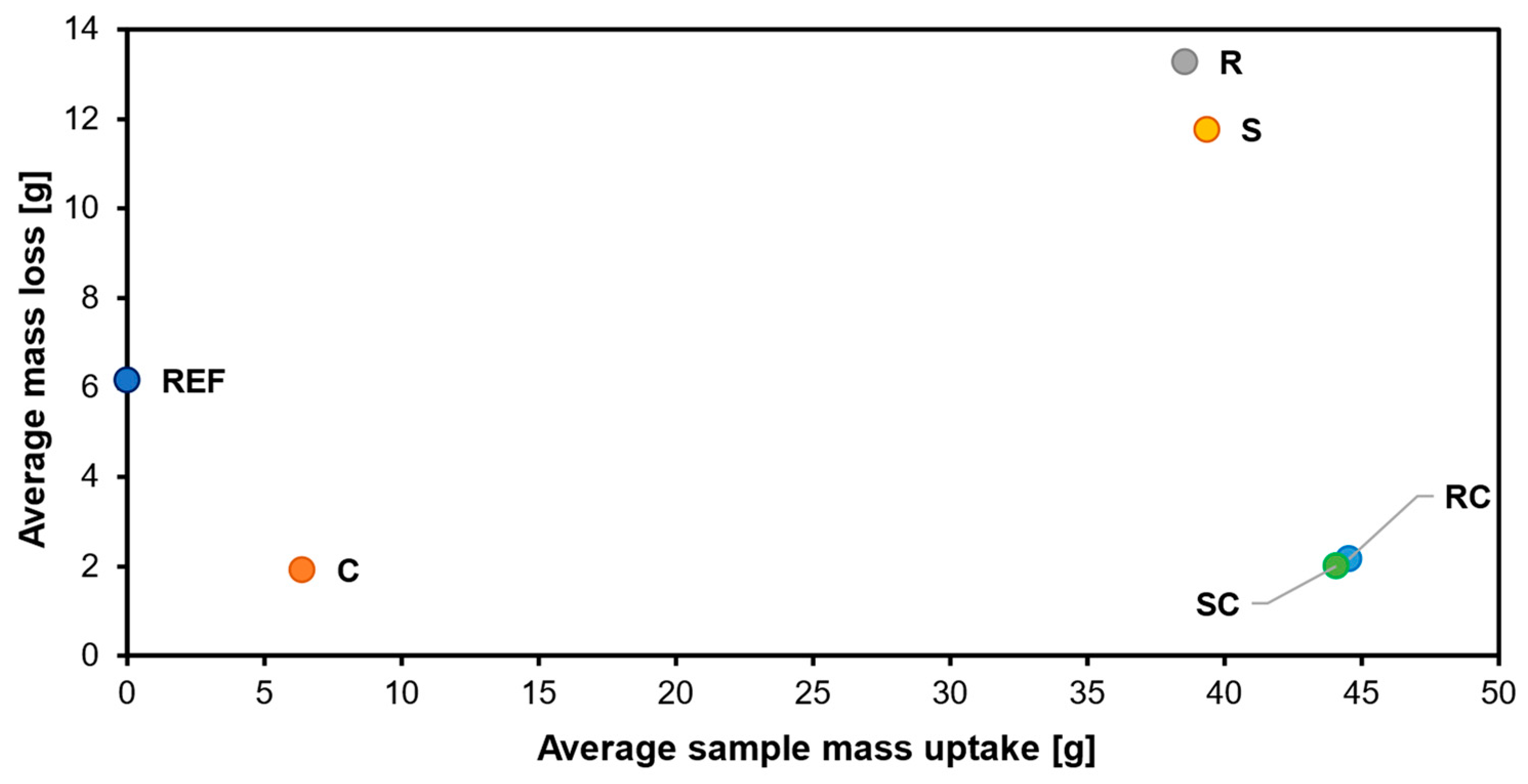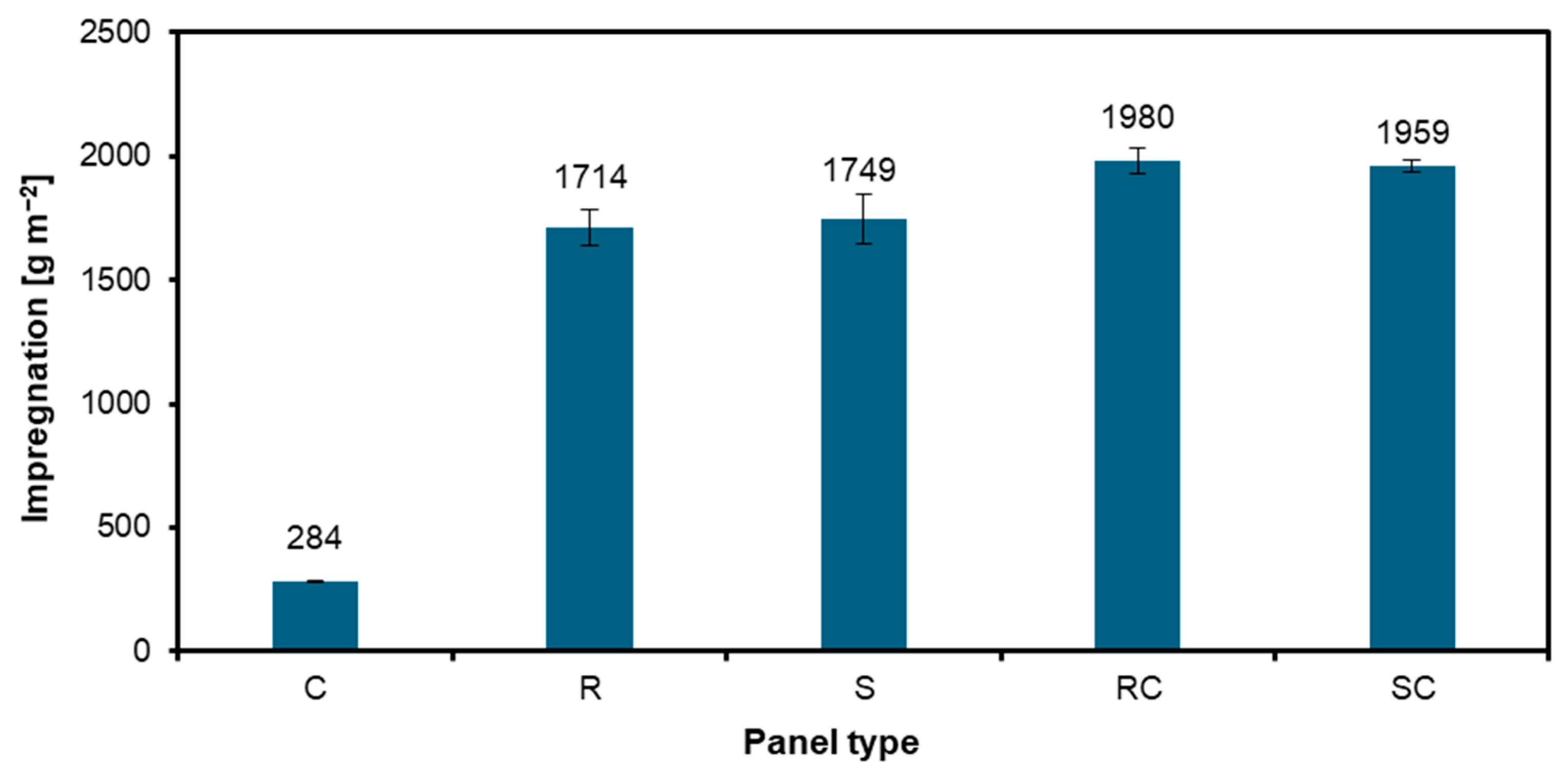 - Room temperature, 0.015 MPa vacuum (as above), 5 min impregnation by water-rapeseed lecithin solution, 72 h drying in the drying chamber at 70 °C, followed by (1) modification (hereafter called “RC”; 4 samples).
