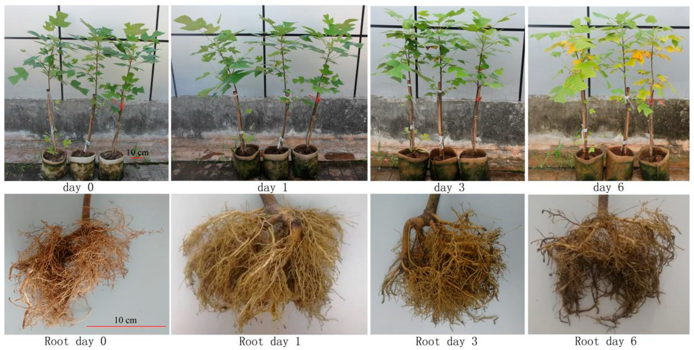 - Sun, X.; Chen, M.; Li, Y.; Wu, Z.; Zhong, Y.; Yu, F. Variations in physiological and biochemical responses in clones of Liriodendron tulipifera under flooding stress. Plant Physiol. J. 2018, 54, 473–482. [Google Scholar] [CrossRef]