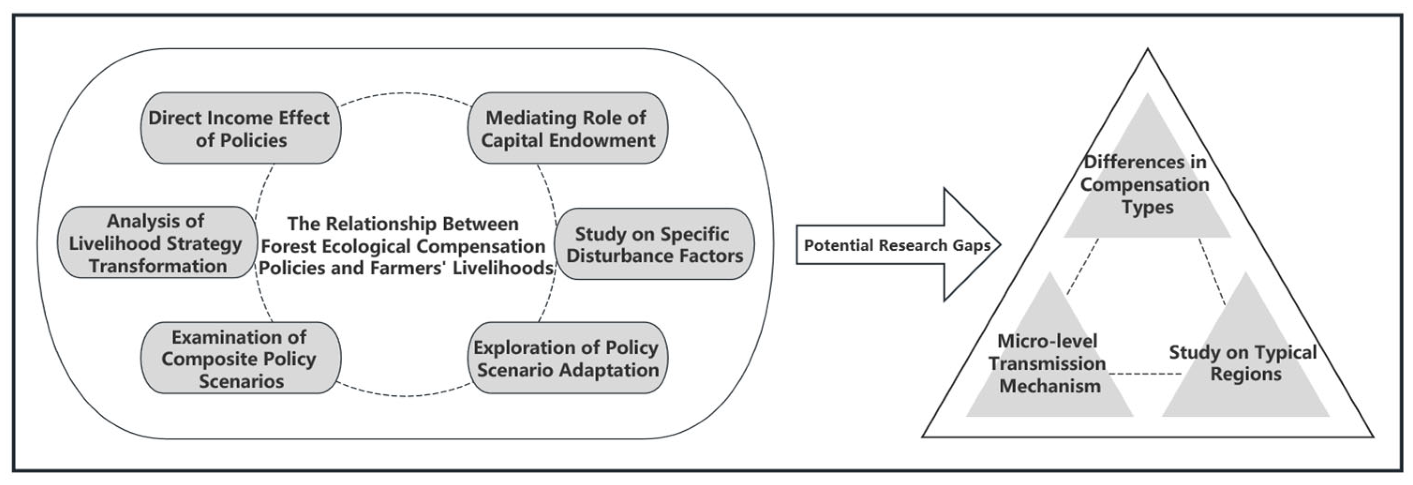Overall, the existing literature has accumulated a rich body of knowledge regarding policy effect evaluation, exploration of transmission mechanisms, differentiation of policy instruments, and embedding in complex contexts. However, two potential research gaps remain (Figure 1): On the one hand, the “black box” of forest ecological compensation policies (FECPs) has not been fully opened. Most existing studies treat diverse compensation methods homogenously, overlooking the potential differences in effects and the distinct mechanisms of action between “blood-transfusion” and “blood-making” compensation, which differ in their institutional logics. Furthermore, while studies often directly link FECPs with livelihood outcomes, there is a lack of clear empirical testing on the specific transmission pathway—namely, how FECPs differentially influence farmers’ strategy choices by altering their livelihood capital endowments. On the other hand, there is insufficient attention paid to real-world scenarios characterized by complex tenure systems and large-scale coverage. Existing empirical cases primarily focus on regions with relatively clear property rights and limited compensation scopes. For protected areas dominated by forests in southern China—such as Wuyi Mountain National Park, which features a high proportion of collective forest tenure and broad compensation coverage—the implementation logic and adaptation patterns of compensation policies have not been fully revealed. This may limit the generalizability and operational applicability of policy insights from existing research when addressing the typical yet complex realities of southern China’s collective forest regions.