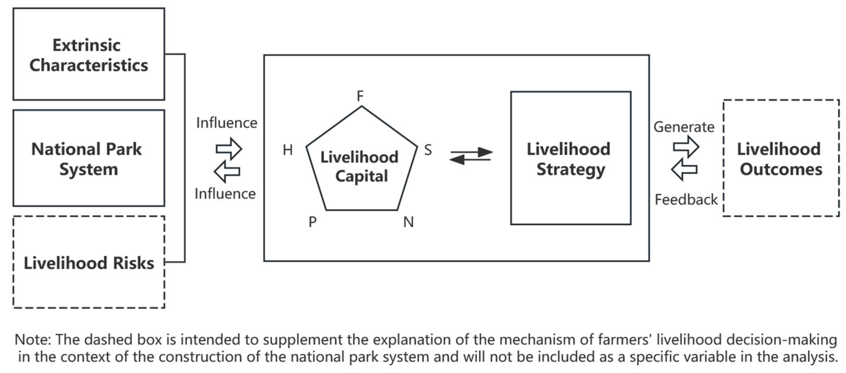 Forest ecological compensation policies (FECPs) in China are not only directly linked to farmers’ livelihoods but also involve complex issues such as collective forest ownership and the marketization of ecological products, reflecting distinct national characteristics. Since the 1990s, China’s FECPs have gradually emerged and evolved, transitioning from single-purpose compensation for ecological public welfare forests to diversified payments for ecosystem services, and from a government-dominated model to one combining government guidance with market-based supplements [17,18]. Following the explicit call in the 2017 Master Plan for Establishing a National Park System to “improve the ecological conservation compensation system”, the development of China’s national park system has advanced comprehensively, leading to increasingly rich research on FECPs. Scholars have demonstrated the necessity and urgency of establishing a forest ecological compensation system within national parks [19], analyzed key issues such as “who to compensate” and “how much to compensate” [20], evaluated the costs and benefits of ecological compensation [21], and constructed policy frameworks and content standards for FECPs [22]. At the micro level, Chinese scholars have also conducted extensive empirical studies on the impact of FECPs on farmers’ livelihoods. Early research primarily focused on the direct effects of policies such as the Grain for Green Program [23], livestock [24] and poultry breeding bans [25], and ecological relocation on farmers’ livelihoods and incomes, providing a preliminary basis for assessing FCEP outcomes. As research deepened, the academic community gradually recognized that policies often do not act directly on outcomes but rather exert influence by reshaping household resource endowments. Subsequent studies introduced the Sustainable Livelihoods Framework, with substantial empirical evidence indicating that livelihood capital serves as a key mediator linking FECPs to household behavioral decisions. Whether in wetland compensation [26], herder asset allocation [27], or the livelihood transition of households exiting livestock farming [28], livelihood capital plays a central transmission role. In recent years, micro-empirical research has further advanced toward greater refinement and contextual relevance, mainly reflected in two aspects: First, by deconstructing and differentiating FECPs themselves. For example, some studies specifically analyze the heterogeneous impacts of ecological public welfare forest compensation on forest farmers’ livelihoods [29], while others examine how diverse compensation methods guide households toward different development pathways [30]. Second, by conducting field investigations embedded in the specific ecological constraints and rural social contexts of national parks. Such research not only focuses on the overall improvement effects of national park FECPs on community livelihoods [31] but also sensitively identifies new problems arising from conservation actions, such as the impact of human–wildlife conflict on farmers’ livelihoods and their adaptation strategies [32].