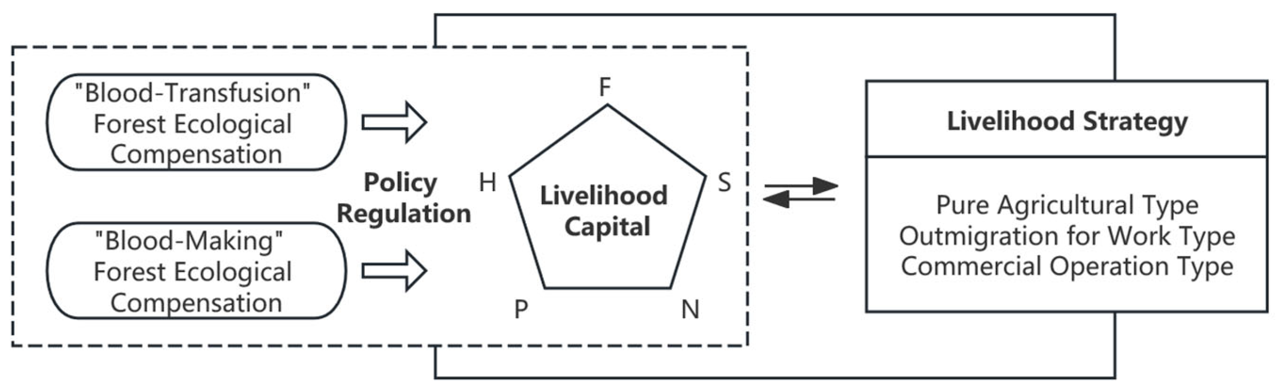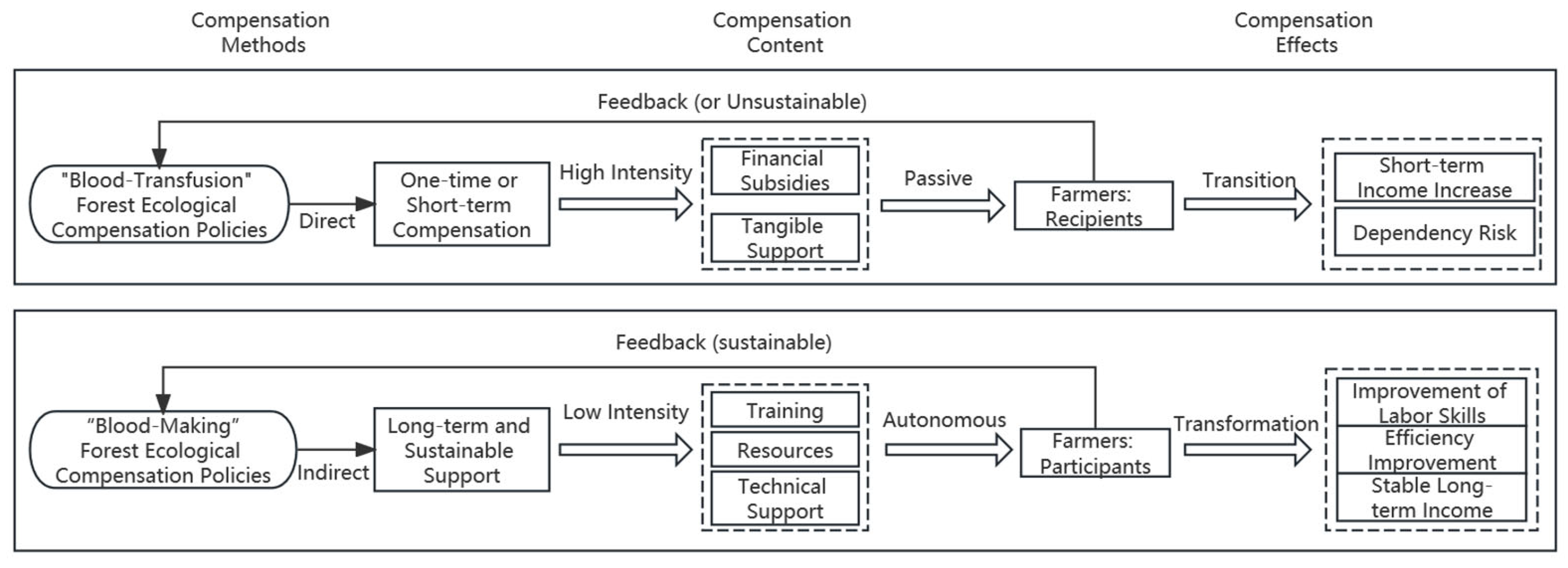 At the current stage, forest ecological compensation policies (FECPs) in national parks can be categorized into two types: “blood-transfusion” and “blood-making”. These two types differ in terms of compensation methods, target groups, and functional purposes, which in turn affect farmers’ livelihoods in practice [26] (Figure 3). “Blood-transfusion” FECPs mainly refer to one-time compensation in the form of monetary funds or in-kind materials, including compensation for ecological public welfare forests, buyouts of commercial forests, and compensation for forest right owners. After participating in “blood-transfusion” compensation, farmers can receive one-time, short-term financial subsidies. However, their original opportunities for planting, harvesting, and developing forest resources may be restricted as a result. In contrast to the one-time, short-term nature of the former, “blood-making” FECPs aim to enhance the economic self-sufficiency capacity of compensated areas, with a focus on long-term economic and social development. This approach involves measures such as subsidizing initial investments for national park community residents engaged in organic forestry production, supporting the development of green forestry industries, and providing skills training and necessary technical assistance. These efforts help farmers improve their labor skills and production efficiency, thereby achieving economic self-improvement. Although the initial economic support provided by “blood-making” FECPs may be lower than that of “blood-transfusion” FECPs, through long-term investment in human capital, farmers can achieve stable income growth and economic self-sustainability, forming a more sustainable livelihood situation [37,38,39,40].