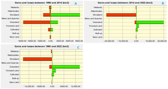 Temporal dynamics of forest land showing gains (green) and losses (red) in km2 across three study periods: (A) between 1990 and 2014, (B) between 2014 and 2022 and (C) between 1990 and 2022.