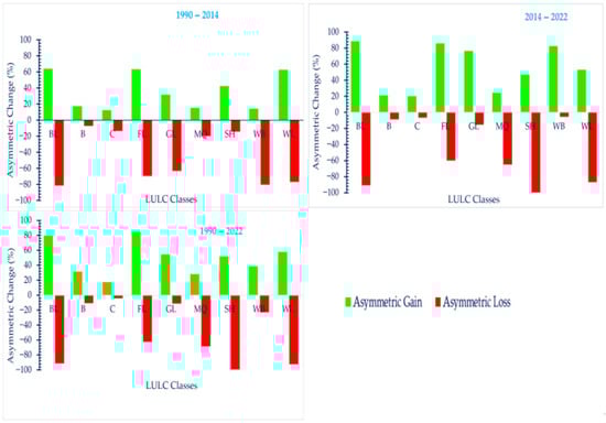An asymmetric change analysis was applied to quantify the directional dynamics of land cover transitions. Unlike simple net change, this method separately considers gains and losses, providing a more nuanced understanding of landscape change. For each land cover class, the percentage of loss was calculated relative to its area in the base year, while the percentage of gain was calculated relative to its area in the final year. This approach allows identification of “source” areas, where a class is expanding, and “sink” areas, where it is declining, revealing spatial and ecological patterns of land cover transformation that a net change metric alone cannot capture (Equations (4) and (5)). It effectively captures the non-reciprocal nature of class transitions, supporting more nuanced interpretations of landscape change for planning and policymaking.