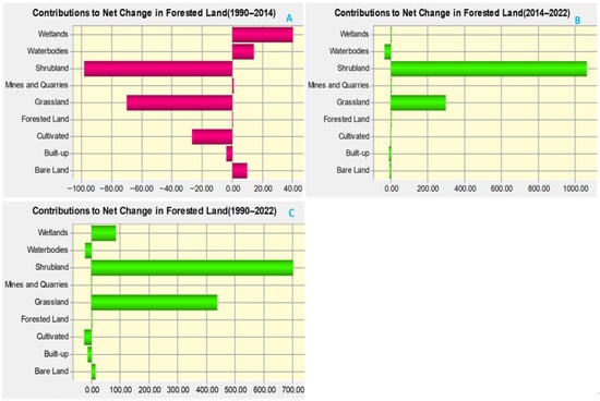 Contributions of different LULC classes to net forest change in km2 across the study periods: (A) between 1990 and 2014, (B) between 2014 and 2022 and (C) between 1990 and 2022 highlighting the relative influence of each class on forest expansion and contraction.