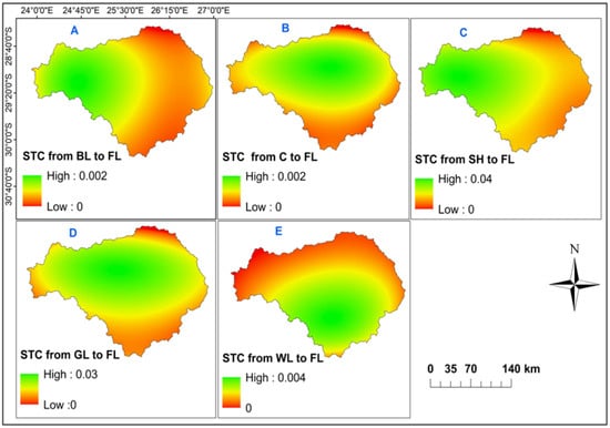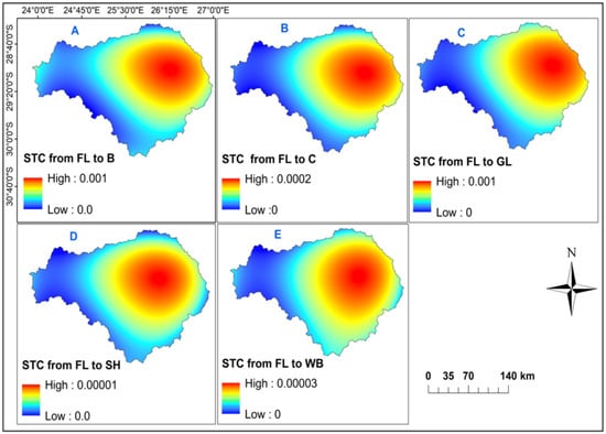As shown in Figure 10, forest land (FL) also underwent conversion to other LULC classes, particularly in the central, eastern, and east-central regions, where human activities such as urban and agricultural expansion are concentrated. These interventions have led to localized deforestation and the formation of conversion hotspots, even though the magnitude of forest contraction is smaller than the expansion discussed above. For instance, FL was converted to B in the central and eastern regions with an STC value of 0.001, while no change occurred in the western region (STC = 0.0) (Figure 10A). Overall, conversions from FL to B, FL to C, and FL to GL were minimal, whereas transitions to SH and WB were negligible across the same areas (Figure 10A–E).