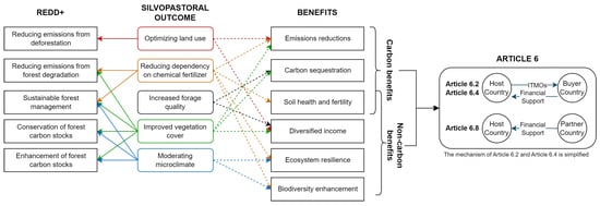 While funding through compliance mechanisms under Article 6 is often primarily focused on emission reductions rather than on generating or sustaining non-carbon benefits [41], the inclusion of silvopastoral systems through REDD+ activities under Article 6 goes beyond emission reduction (Figure 2). The non-carbon benefits generated by silvopastoral systems align closely with the elements required in Article 6 documentation (Table 3), reflecting their potential to contribute to both environmental and socio-economic objectives. Moreover, agroforestry systems are often rooted in long-standing experience and local knowledge with high cultural importance, which enhances their compatibility with REDD+ safeguards and broader sustainability objectives [43].