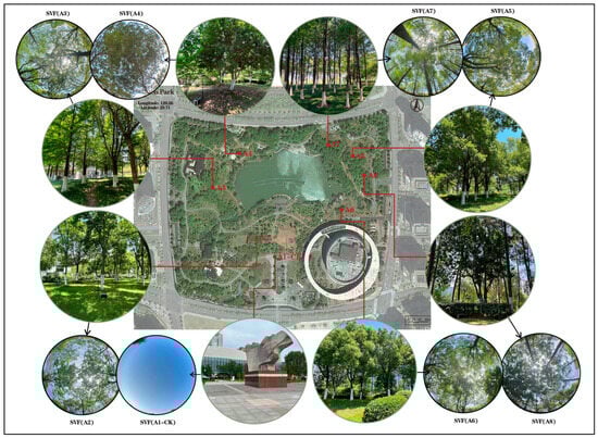 Eight sampling points were selected within Citizen Park for field measurements. The park is centrally located, surrounded by high-rise commercial buildings, and experiences high pedestrian volume, and thus represents a typical urban green space. These points, labeled A1-CK to A8, include A1-CK, a control point with no vegetation cover, while the remaining seven are situated in plant communities with distinct layout characteristics. The geographical location of the study area and the distribution of sampling sites are shown in Figure 1. The vegetation conditions at each of the sampling points and the Sky View Factor (SVF) are shown in Figure 2.