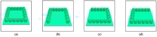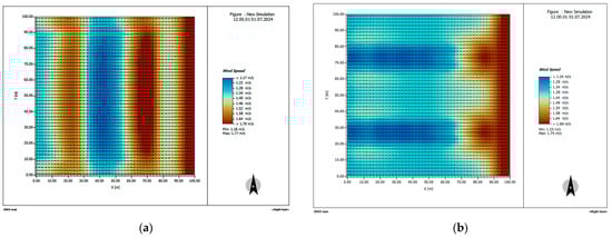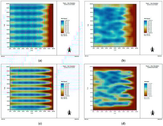 To evaluate the microclimatic effects of different horizontal layouts, a series of scenarios was modeled within a 100 m × 100 m domain featuring a tree-grass vertical structure. The simulated layouts included the following [25]: