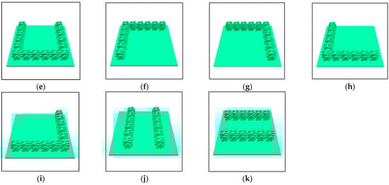 Figure 6. Three-Dimensional model representations of plant communities with different horizontal layout forms: (a) 3D model of “mouth-shaped” plant landscape space; (b) 3D model of the “U-shaped” plant landscape space (South-facing); (c) 3D model of the “U-shaped” plant landscape space (West-facing); (d) 3D model of the “U-shaped” plant landscape space (East-facing); (e) 3D model of the “U-shaped” plant landscape space (North-facing); (f) 3D model of the “L-shaped” plant landscape space (Southeast); (g) 3D model of the “L-shaped” plant landscape space (Southwest); (h) 3D model of the “L-shaped” plant landscape space (Northeast); (i) 3D model of the “L-shaped” plant landscape space (Northwest); (j) Parallel line type 3D model drawing (North–South); (k) Parallel line type 3D model drawing (East–West).