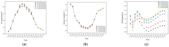 Specifically, from 7:00 a.m. to 10:00 p.m., for every 2 m decrease in tree spacing, the daily average air temperature beneath the canopy decreases by 0.13 °C, 0.16 °C, 0.17 °C, 0.26 °C, and 0.35 °C, respectively, showing a progressively stronger cooling effect (Figure 10, Table 4). This indicates that higher planting densities augment the trees’ shading and transpiration functions, thereby exerting a powerful cooling influence. Concurrently, as tree spacing diminishes, the daily average relative humidity beneath the canopy rises, suggesting that denser planting enhances humidity regulation. For each 2 m reduction in tree spacing, the daily average humidity increases 0.20%, 0.32%, 0.22%, 0.27%, and 0.55%, respectively. Regarding wind speed, the impact of tree spacing on airflow is striking. The findings reveal that as tree spacing is reduced from 18 m to 14 m, wind speed gradually increases. However, when spacing is further reduced to 8 m, wind speed begins to decline, peaking at a tree spacing of 14 m. This pattern illustrates that moderate-density tree spacing optimizes airflow pathways. Specifically, wide tree spacing results in insufficient canopy cover, diminishing wind speed regulation, while close spacing hampers airflow due to overly dense vegetation. Thus, a tree spacing of 14 m appears optimal for balancing airflow and other microclimate benefits.