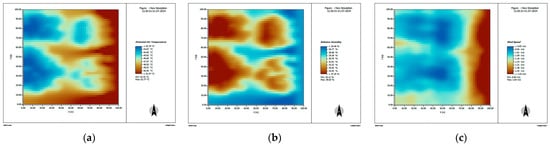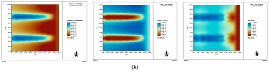 Distribution of air temperature, humidity, and wind speed in plant communities with different horizontal layout forms. (a) The air temperature, humidity, and wind speed at 1.4 m height were 50.76 °C, 26.95%, and 1.545 m/s at 12:00 p.m. with the “mouth-shaped” plant communities, respectively (spatial average). (b) The air temperature, humidity, and wind speed at 1.4 m height were 51.06 °C, 26.49%, and 1.525 m/s at 12:00 p.m. with the “U-shaped, South-facing” plant communities, respectively (spatial average). (c) The air temperature, humidity, and wind speed at 1.4 m height were 51.05 °C, 26.49%, and 1.526 m/s at 12:00 p.m. with the “U-shaped, North-facing” plant communities, respectively (spatial average). (d) The air temperature, humidity, and wind speed at 1.4 m height were 51.18 °C, 26.41%, and 1.415 m/s at 12:00 p.m. with the “U-shaped, East-facing” plant communities, respectively (spatial average). (e) The air temperature, humidity, and wind speed at 1.4 m height were 50.96 °C, 26.01%, and 1.505 m/s at 12:00 p.m. with the “U-shaped, West-facing” plant communities, respectively (spatial average). (f) The air temperature, humidity, and wind speed at 1.4 m height were 51.59 °C, 25.81%, and 1.431 m/s at 12:00 p.m. with the “L-shaped, Southeast-facing” plant communities, respectively (spatial average). (g) The air temperature, humidity, and wind speed at 1.4 m height were 49.89 °C, 28.11%, and 1.480 m/s at 12:00 p.m. with the “L-shaped, Southwest-facing” plant communities, respectively (spatial average). (h) The air temperature, humidity, and wind speed at 1.4 m height were 51.58 °C, 25.82%, and 1.427 m/s at 12:00 p.m. with the “L-shaped, Northeast-facing” plant communities, respectively (spatial average). (i) The air temperature, humidity, and wind speed at 1.4 m height were 51.28 °C, 26.24%, and 1.479 m/s at 12:00 p.m. with the “L-shaped, Northwest-facing” plant communities, respectively (spatial average). (j) The air temperature, humidity, and wind speed at 1.4 m height were 51.42 °C, 26.05%, and 1.471 m/s at 12:00 p.m. with the “North–South oriented parallel line” plant communities, respectively (spatial average). (k) The air temperature, humidity, and wind speed at 1.4 m height were 51.39 °C, 26.18%, and 1.422 m/s at 12:00 p.m. with the “East–West oriented parallel line” plant communities, respectively (spatial average).