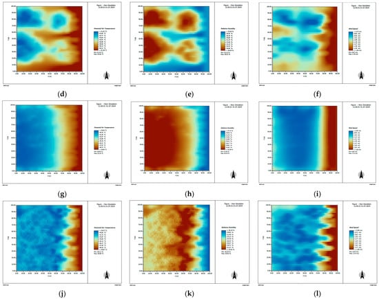 Distribution of air temperature, humidity, and wind speed in plant communities with different tree canopy classifications. (a) The air temperature at 1.4 m height was 47.47 °C at 12:00 p.m. with a single-layer sparse tree canopy (spatial average). (b) The humidity at 1.4 m height was 31.86% at 12:00 p.m. with a single-layer sparse tree canopy (spatial average). (c) The wind speed at 1.4 m height was 1.142 m/s at 12:00 p.m. with a single-layer sparse tree canopy (spatial average). (d) The air temperature at 1.4 m height was 47.08 °C at 12:00 p.m. with a multi-layer sparse tree canopy (spatial average). (e) The humidity at 1.4 m height was 32.35% at 12:00 p.m. with a multi-layer sparse tree canopy (spatial average). (f) The wind speed at 1.4 m height was 1.132 m/s at 12:00 p.m. with a multi-layer sparse tree canopy (spatial average). (g) The air temperature at 1.4 m height was 43.21 °C at 12:00 p.m. with a single-layer closed tree canopy (spatial average). (h) The humidity at 1.4 m height was 39.28% at 12:00 p.m. with a single-layer closed tree canopy (spatial average). (i) The wind speed at 1.4 m height was 1.118 m/s at 12:00 p.m. with a single-layer closed tree canopy (spatial average). (j) The air temperature at 1.4 m height was 42.57 °C at 12:00 p.m. with a multi-layer closed tree canopy (spatial average). (k) The humidity at 1.4 m height was 37.63% at 12:00 p.m. with a multi-layer closed tree canopy (spatial average). (l) The wind speed at 1.4 m height was 0.995 m/s at 12:00 p.m. with a multi-layer closed tree canopy (spatial average).