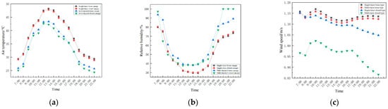 Effects of different tree canopy classifications at a height of 1.4 m on the microclimate of plant communities from 7:00 a.m. to 10:00 p.m. (a) The changes in air temperature from 7:00 a.m. to 10:00 p.m. (b) The changes in humidity from 7:00 a.m. to 10:00 p.m. (c) The changes in wind speed from 7:00 a.m. to 10:00 p.m.