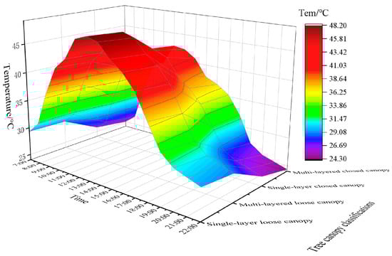 The 3D surface plot illustrates the effects of different tree canopy classifications at 1.4 m on the temperature variation in plant communities from 7:00 a.m. to 10:00 p.m.