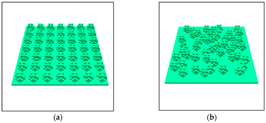 - Dispersed layouts: Both a naturalistic (scattered) and a formal (grid) arrangement. Figure 6 presents the 3D models of these horizontal layouts.