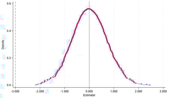 A placebo test is widely used to assess the robustness of DID estimations and to rule out spurious causal relationships. The core idea is straightforward: if the impact of the NFCP is truly causal, then artificially assigning “fake policy treatments” should not yield statistically significant effects. Conversely, if randomized pseudo-policy shocks generate significant coefficients, this would suggest potential identification bias or omitted variable interference in the model [39]. Therefore, the placebo test simulates a counterfactual world in which no real policy exists, examining whether the DID model erroneously detects a “false policy effect,” thereby enhancing confidence in the validity of the actual estimates. In implementation, this study conducts a placebo test using a random permutation approach. The procedure includes the following steps. First, the actual implementation years of the NFCP are randomly reassigned across sample cities, and this process is repeated 1000 times to ensure that the placebo distribution is statistically representative. Second, for each randomized assignment, a DID regression is re-estimated and the resulting “pseudo-policy effect” is recorded. Third, all 1000 estimated coefficients are aggregated to generate the placebo distribution, and a kernel density plot is drawn to visualize the range of effect sizes produced under randomized policy assignment. Finally, by comparing the true policy coefficient with the placebo distribution, we assess whether the real effect significantly deviates from what would be expected by chance.