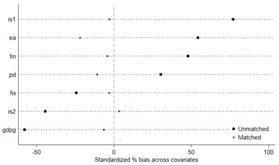 Table 2 reports the mean differences and standardized biases of all control variables between the treated and control groups before and after matching. Prior to matching, substantial disparities exist across multiple covariates. For instance, the standardized biases of industrial structure (is1), labor structure (is2), land economic density (ea), and population density (pd) generally fall within the 30%–80% range, indicating that policy-designated cities differ markedly from non-policy cities in terms of economic structure, demographic characteristics, and other attributes. After conducting one-to-one nearest-neighbor matching, however, the standardized biases of all variables decline significantly to below 10%. Variables such as is1, is2, fis, and fin exhibit reductions in bias exceeding 85%. Moreover, post-matching t-tests fail to reject the null hypothesis of no mean difference, indicating that the covariate balance between treated and control cities has been effectively achieved.