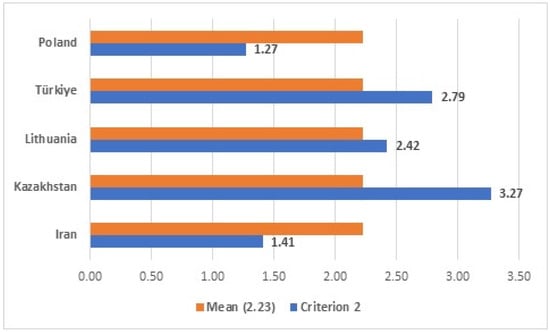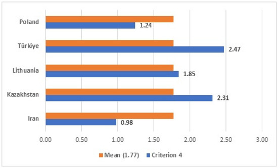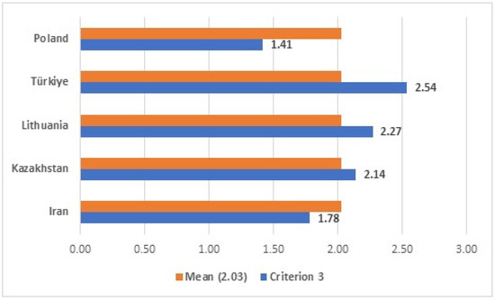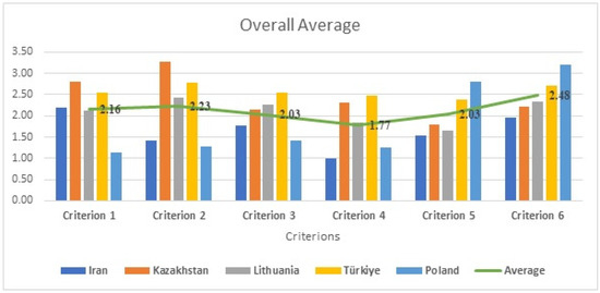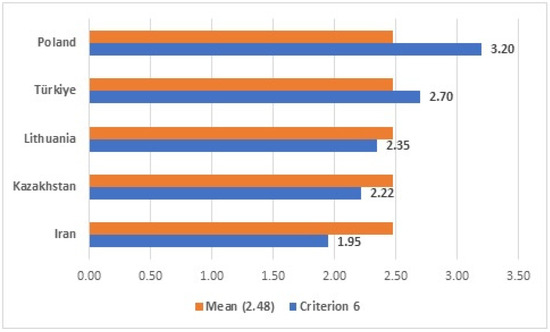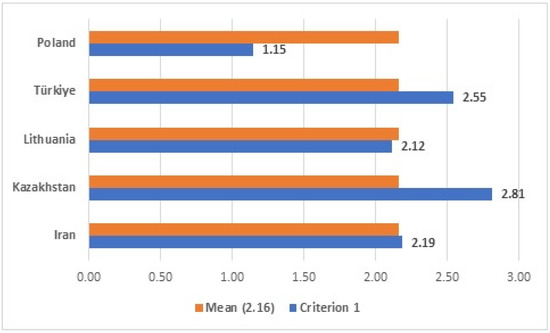 Based on the scoring and overall results, the average score for all criteria is 2.16 for “forest resources and contribution to the global carbon cycle” (criterion 1), 2.23 for “forest health, vitality, and integrity” (criterion 2), 2.03 for “forest production capacity and functions” (criterion 3), 1.77 for “forest biological diversity” (criterion 4), 2.03 for “protective functions of forests” (criterion 5), and 2.48 for “socioeconomic functions of forests” (criterion 6). The overall results of the analysis of the country’s legislation are shown in Figure 1. The sustainability of each country’s legislation has also been evaluated below.