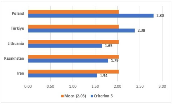 As can be seen from the sustainability table of the country legislation presented in the Supplementary Materials of the study, all articles of forest laws applicable to flora and fauna have been scored. In order to see the differences between countries more clearly and to be able to interpret the average weights, the total examined number of articles in each law is as follows: Iran 59, Türkiye 110, Poland 41, Lithuania 26, Kazakhstan 86.