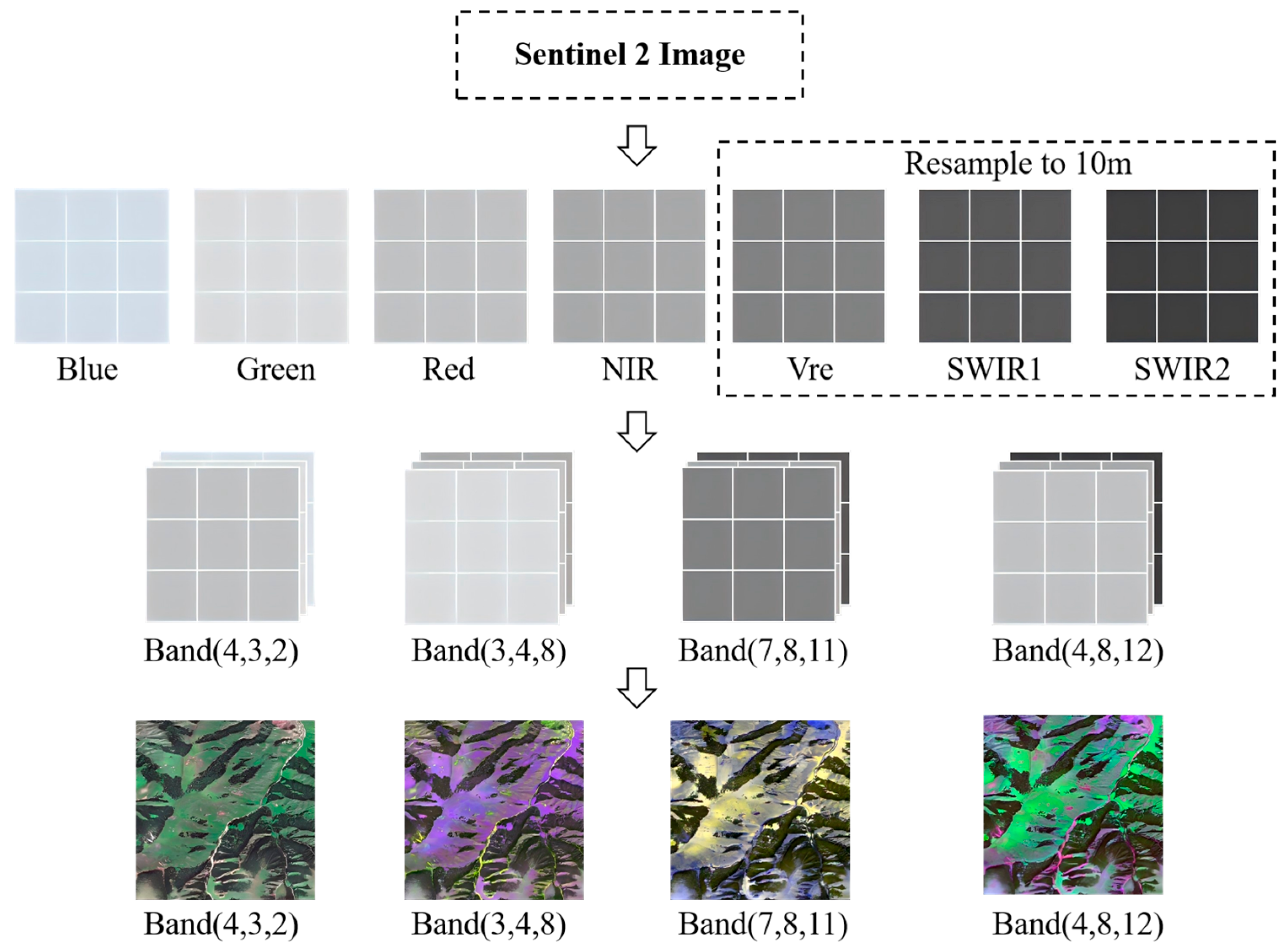 26] also selected this combination for boreal forest species mapping, demonstrating its effectiveness under dense canopy cover. Beyond the blue-green-red combination, different band combinations exhibit distinct characteristics and advantages. The green-red-near-infrared (B3 + B4 + B8) false-color combination is widely applied for vegetation health monitoring and forestland extraction. Bolyn et al. [