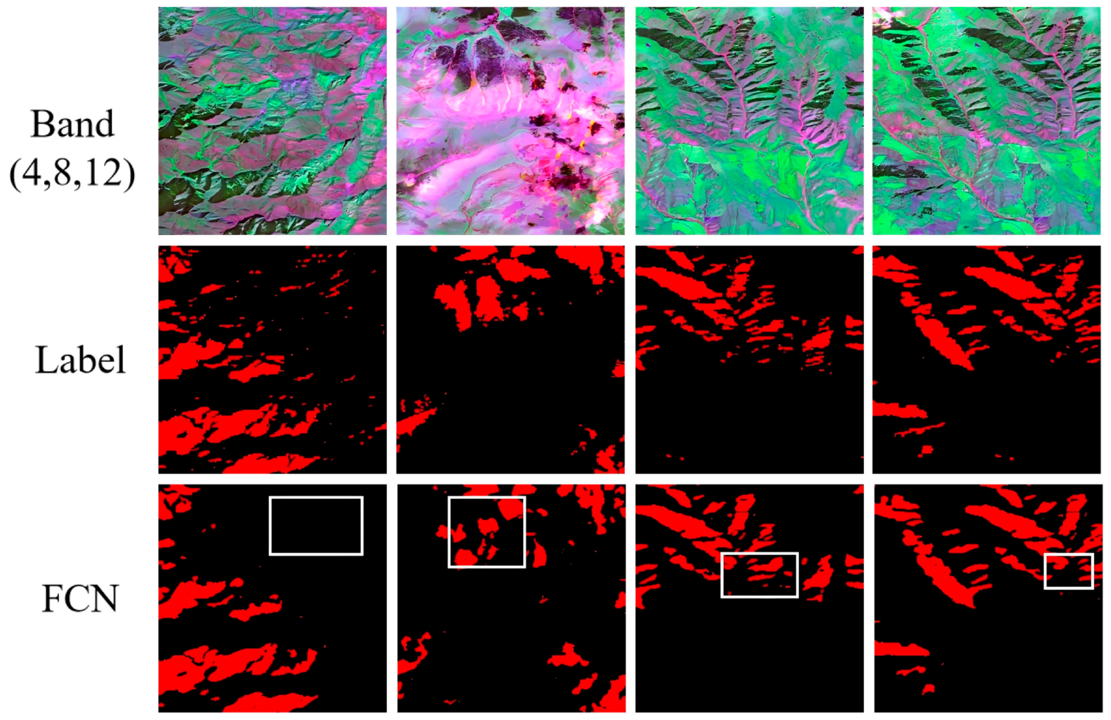 Figure 11 illustrates the performance of the FCN model in extracting small, patchy forest areas under the band combination (B4, B8, B12). Compared to large contiguous forest areas, the FCN model shows reduced performance in identifying small-scale, fragmented forest patches, with segmentation results exhibiting noticeable fragmentation and incompleteness. The local details highlighted by the white box in the third row clearly reveal the following errors: (1) Complete segmentation omissions occur, manifesting as large black backgrounds where actual forest areas should be (segmentation omission errors); (2) detected forest patches exhibit shape distortion and area underestimation, with rough boundaries and internal fractures or voids; (3) non-forest areas (e.g., alpine meadows or shadow zones) are misclassified as forest, forming isolated red spots. These phenomena primarily stem from FCN’s shallow network architecture and simplistic upsampling strategy. This results in limited receptive fields and insufficient fusion of multi-scale contextual information. When confronted with small forest patches exhibiting weak spectral responses, blurred boundaries, and highly dispersed spatial distribution, its feature representation capability rapidly degrades, making it difficult to effectively capture fine-grained semantic details and precise edge information.