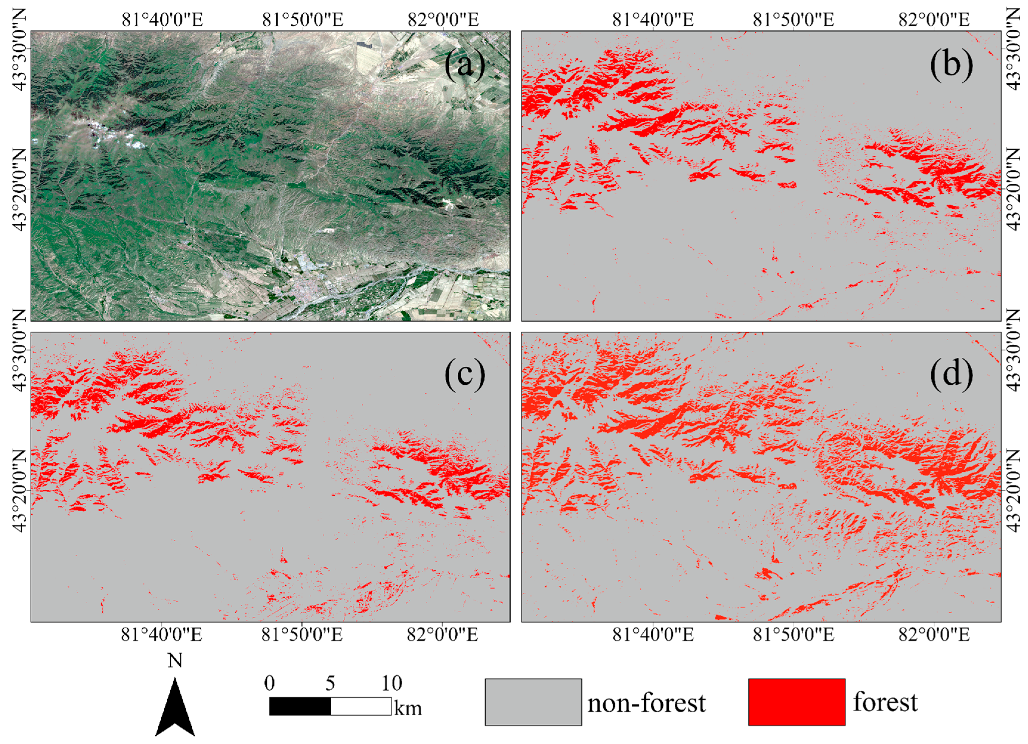 In recent years, significant progress has been made in forest land extraction using Sentinel-2 imagery combined with machine learning or deep learning. In relatively homogeneous vegetation areas such as European temperate forests and Asian mountainous regions, Huang et al. achieved an overall accuracy (OA) of 90.4% when mapping plantation tree species using multi-temporal Sentinel-2 data [