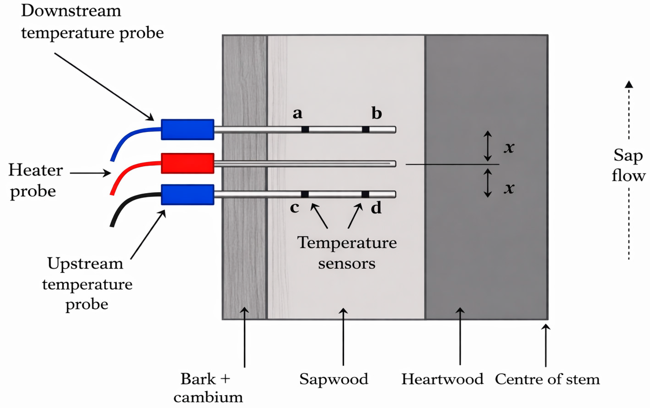 SF density was primarily controlled by climatic factors, with tree size playing only a minor role. The mean temperature in late winter and mid-summer stimulated sap-flow density, whereas relative humidity during these same periods had significant negative effects, reducing sap-flow activity.