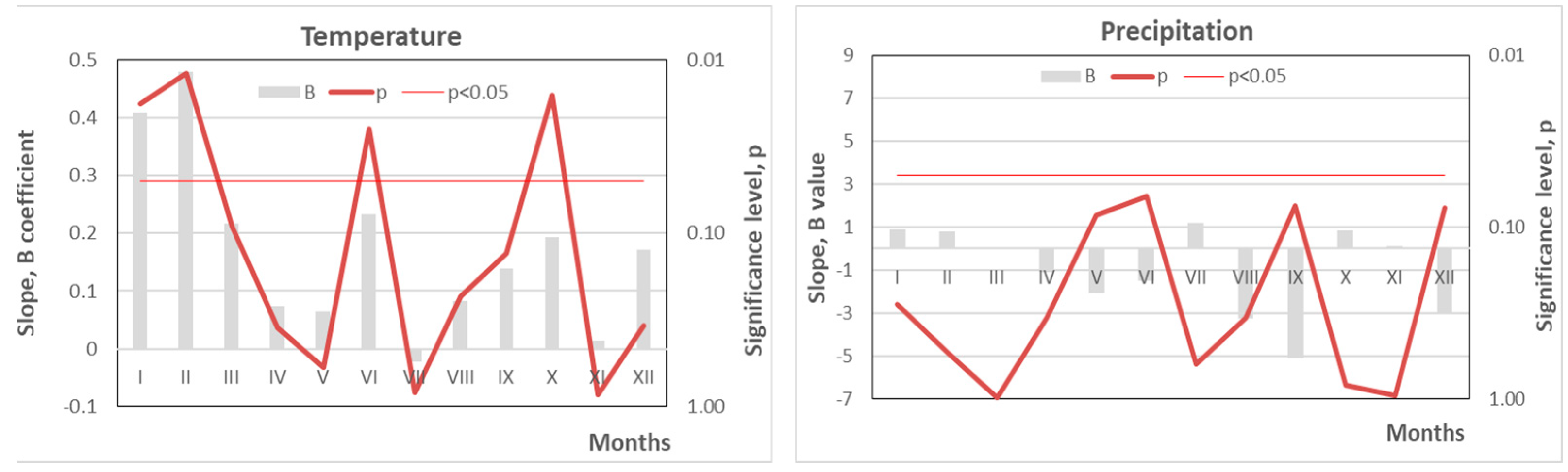 In parallel, this rapid Tm increase was accompanied by declining Pr, particularly in May, June, September, and December. Reductions of 3–5 mm per year were observed, with near-significant trends (