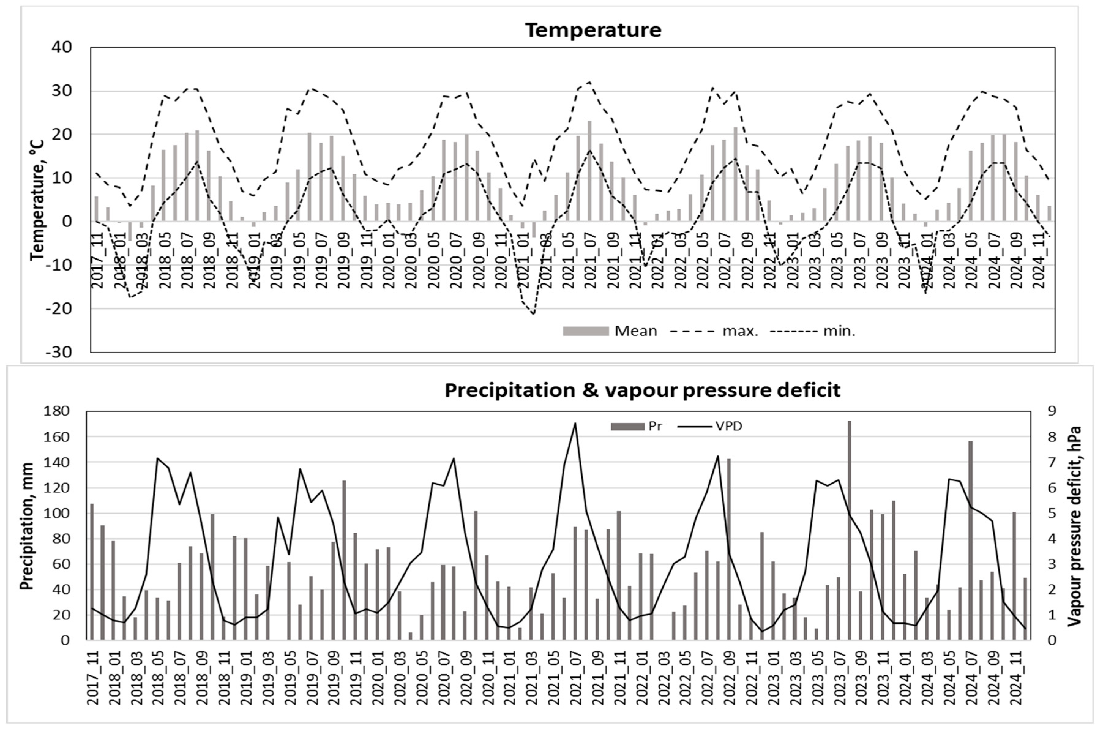 The observed meteorological patterns revealed that June to August were characterized by the highest VPD when its values reached up to 6 hPa, with maximum values approaching 8 hPa—particularly in June (