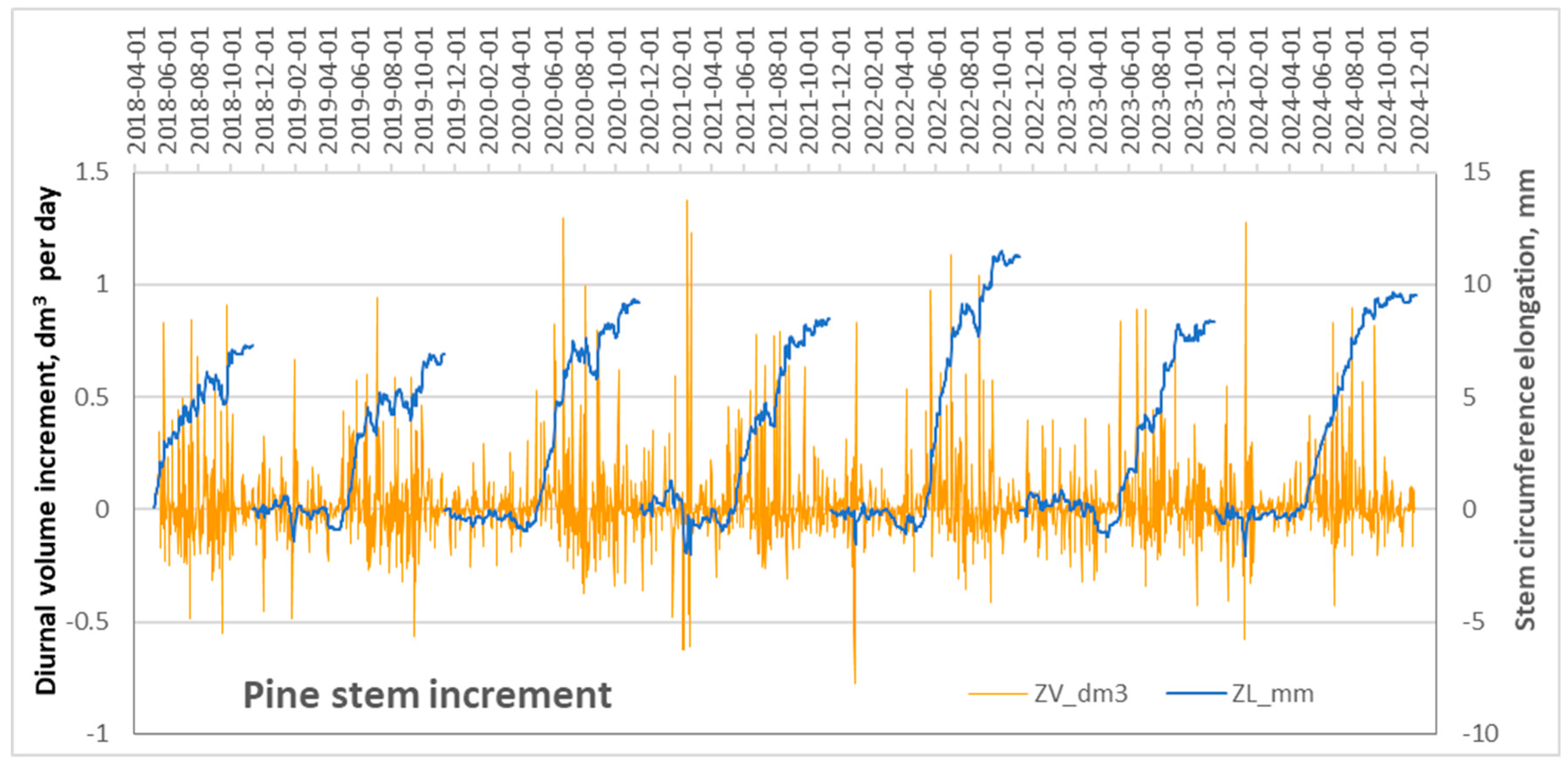 High-resolution measurements of seasonal changes in pine stem circumference were obtained using electronic DRL dendrometers, generating mean datasets at a diurnal scale. These measurements captured not only cumulative stem increment but also short-term fluctuations in stem size caused by diurnal shrinkage and swelling driven by changes in stem water status [