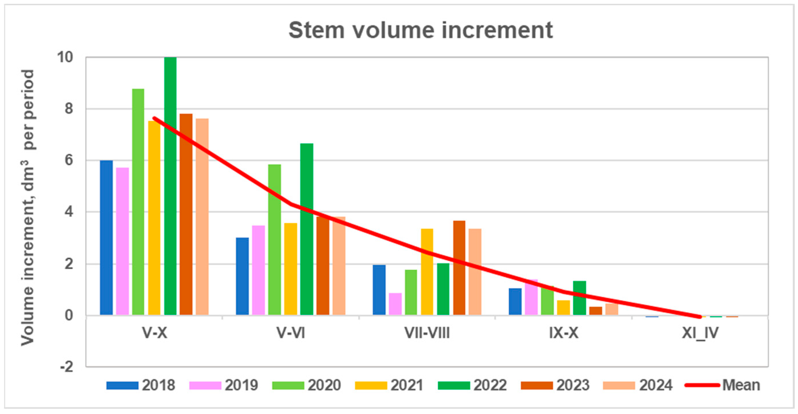 Figure 8). The dormant period lasts from November to April (XI–IV). These periods contributed 55%, 30%, 15%, and 0% to the annual stem volume increment, respectively.