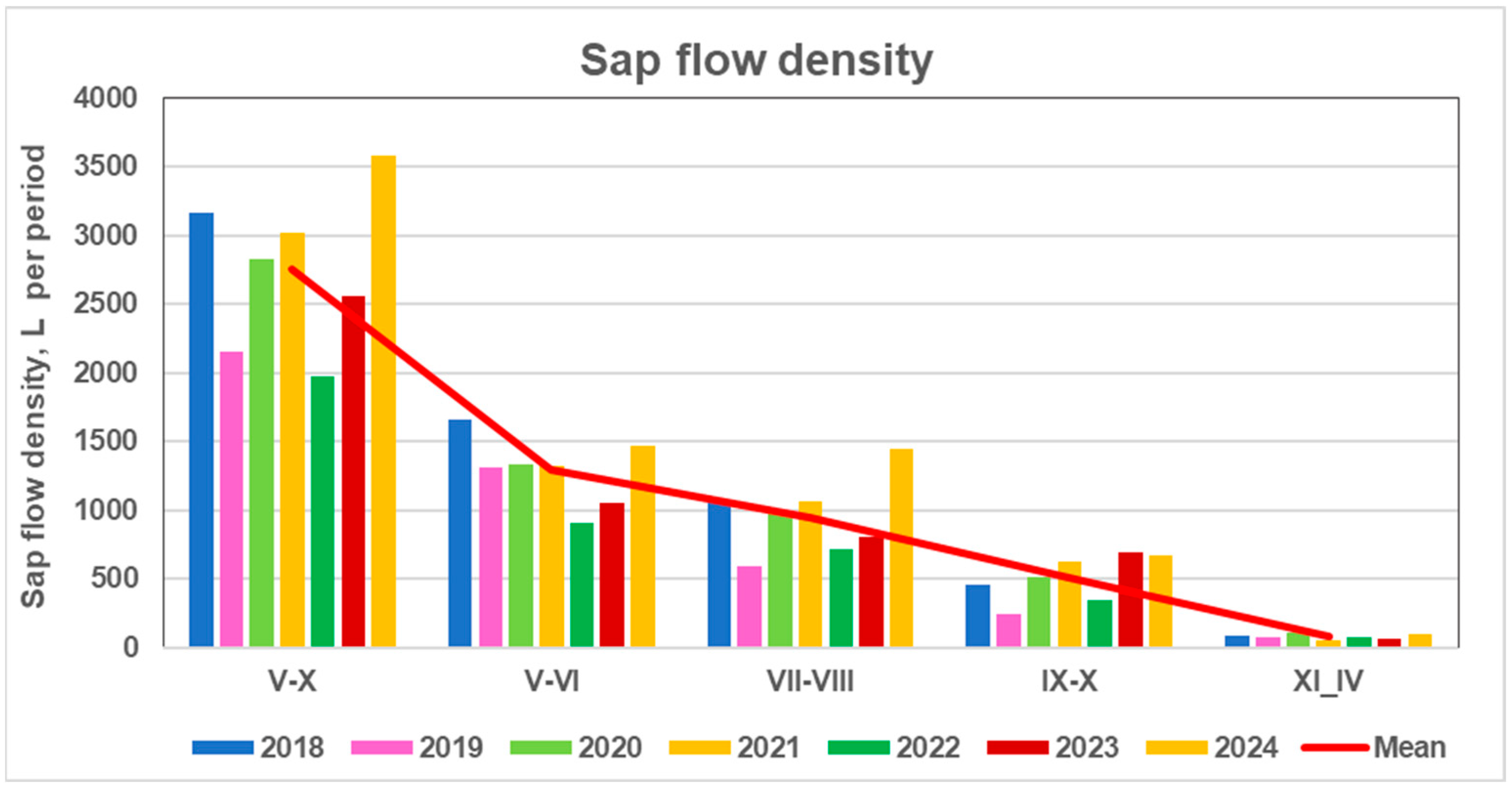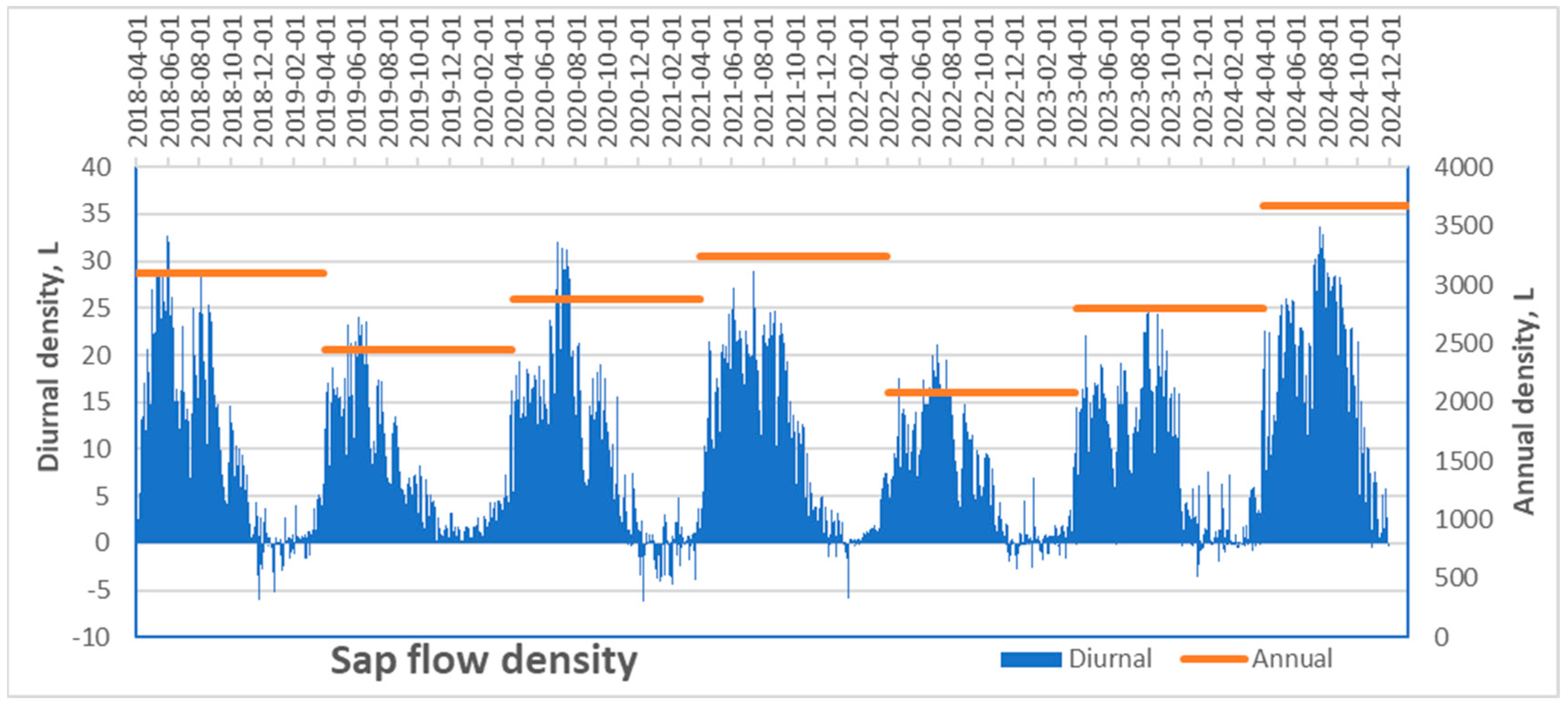 The maximum transpiration rate in 2024 occurred throughout the entire year, with particularly high values between May to October. No negative mean monthly transpiration rates were observed in any of the studied pine trees. Sap flow intensity during the mid-season period contributed most strongly to annual sap flow density (r = 0.94,