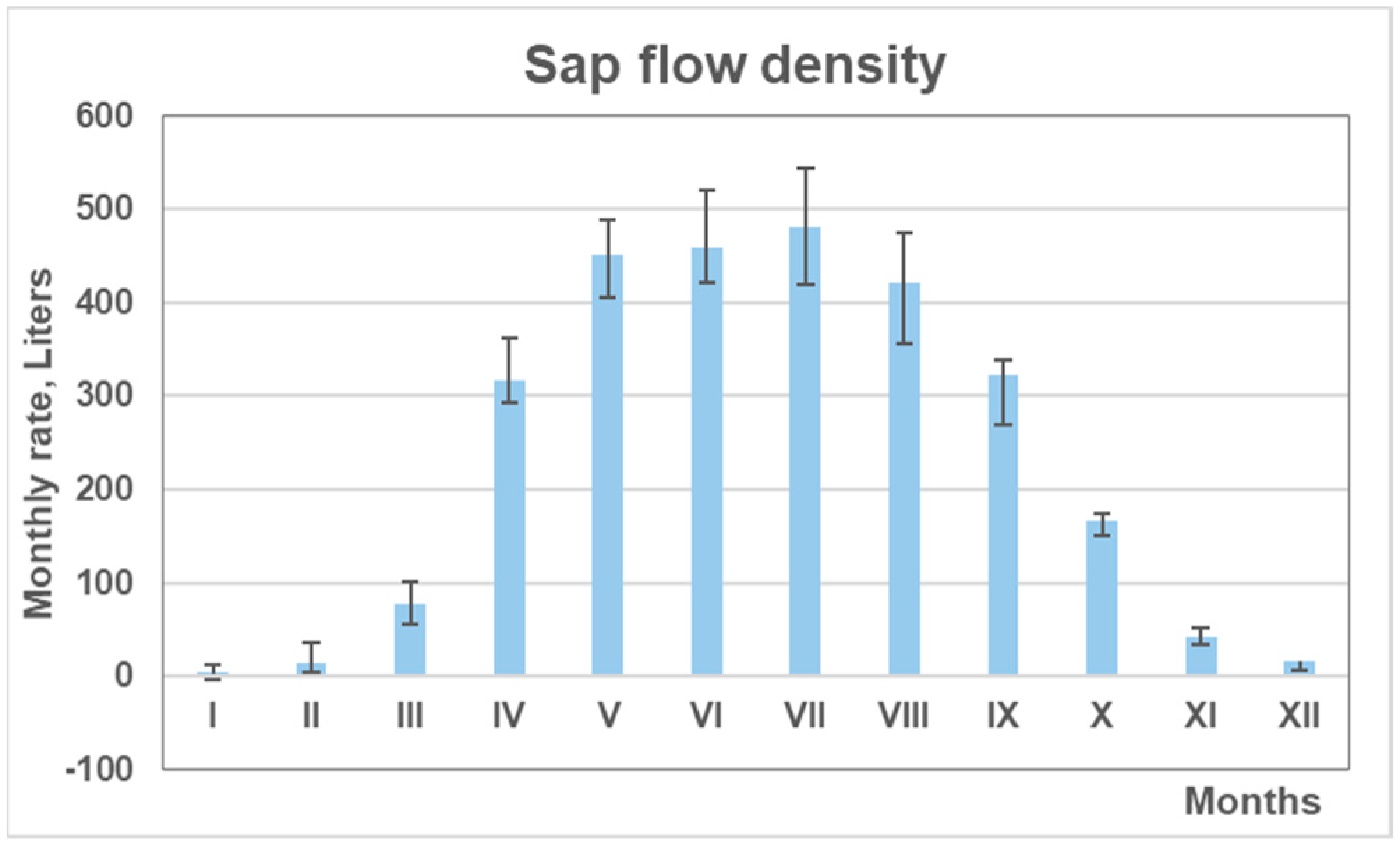 Figure 10). During this period, transpiration rates averaged around 450 L per month. The data indicate that ecophysiological activity at the study site typically begins in early March (III) and continues until mid-November (XI).